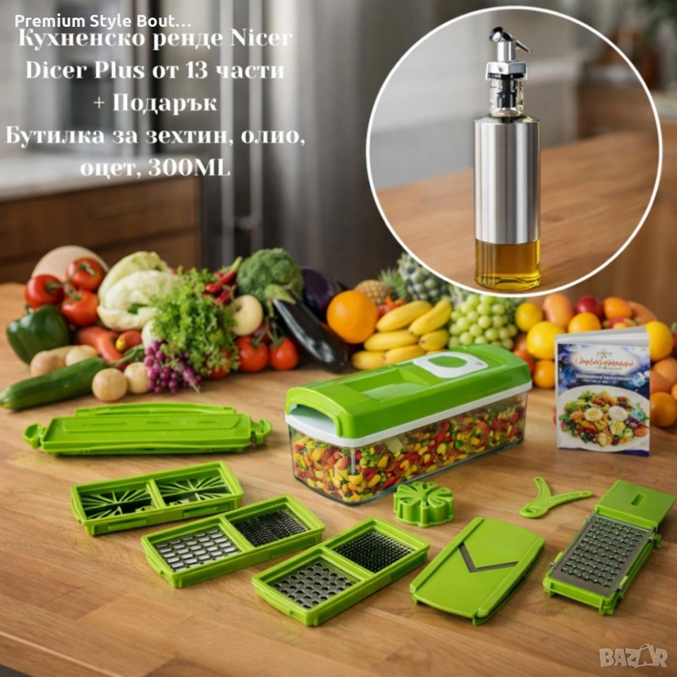 Технически характеристики на Кухненско Ренде за зеле, моркови с контейнер - Nicer Dicer Plus от 13 части + Подарък Бутилка за зехтин, олио, оцет, 300ML Подробни данни за продукта, които да ви помогнат да прецените ползите: Номер на модела: 010 Цвят: зелен Материал: ABS пластмаса и метал Тегло на артикула: 1.4 кг Размери на продукта: 31.4 см х 16.2 см х 13.4 см Капацитет на контейнера: 1.5 л Приставки: решетки 6×6 мм, 12×12 мм, 18×18 мм, вълнообразен елемент, V-образен елемент, разделители за 4 и 8 части, настъргваща приставка Белачка с удобен захват Бутилка-подарък: вместимост 300 мл, стъкло + неръждаема стомана, размери: дължина 6.5 см, височина 25.5 см Гаранция: 12 месеца