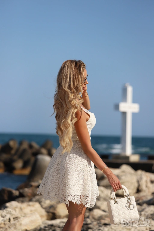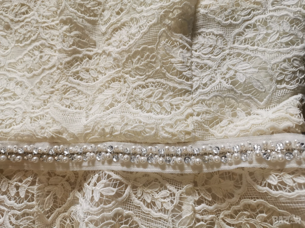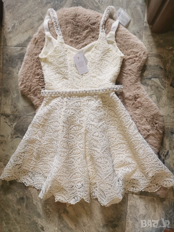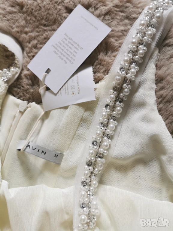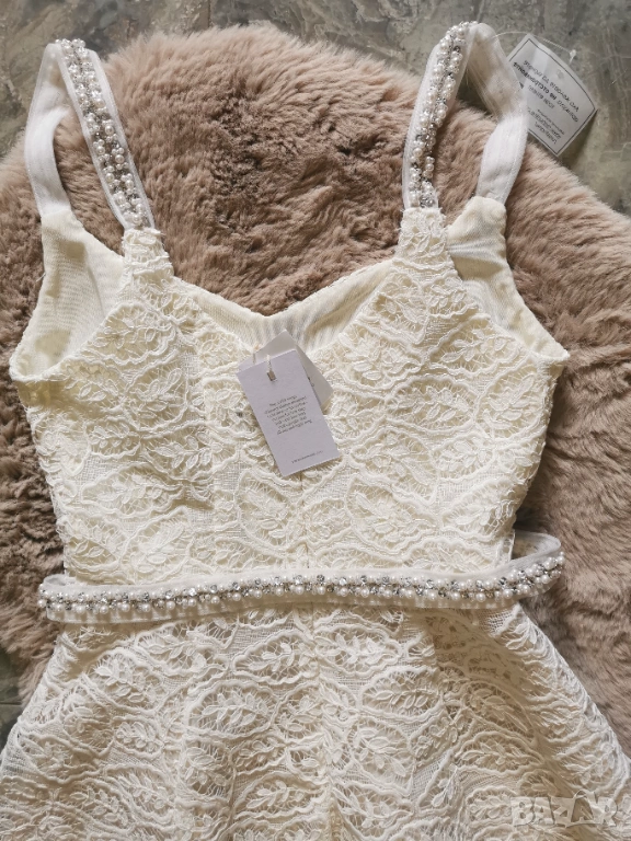 Чисто нова рокля с етикет Avin от дантела с перли, камъни и коланче, размер М. Цена 169€. Докоснете се до красотата на най-луксозните материи – роклята е изработена от френска дантела с колосан ефект и флорални мотиви. Роклята има прилягащ силует в горната част, като се разширява леко надолу в разкроена пола. Презрамките също са с ръчно нашити перли, мъниста и камъни, придавайки допълнителен фин и женствен акцент. Талията е подчертана с тънък колан с перли и мъниста, който е подвижен. Роклята съчетава елегантност и стил и е изключително подходяща за официални поводи на открито - морски сватби, коктейли или романтични вечери. Материята няма еластичност, но не е умалена.
