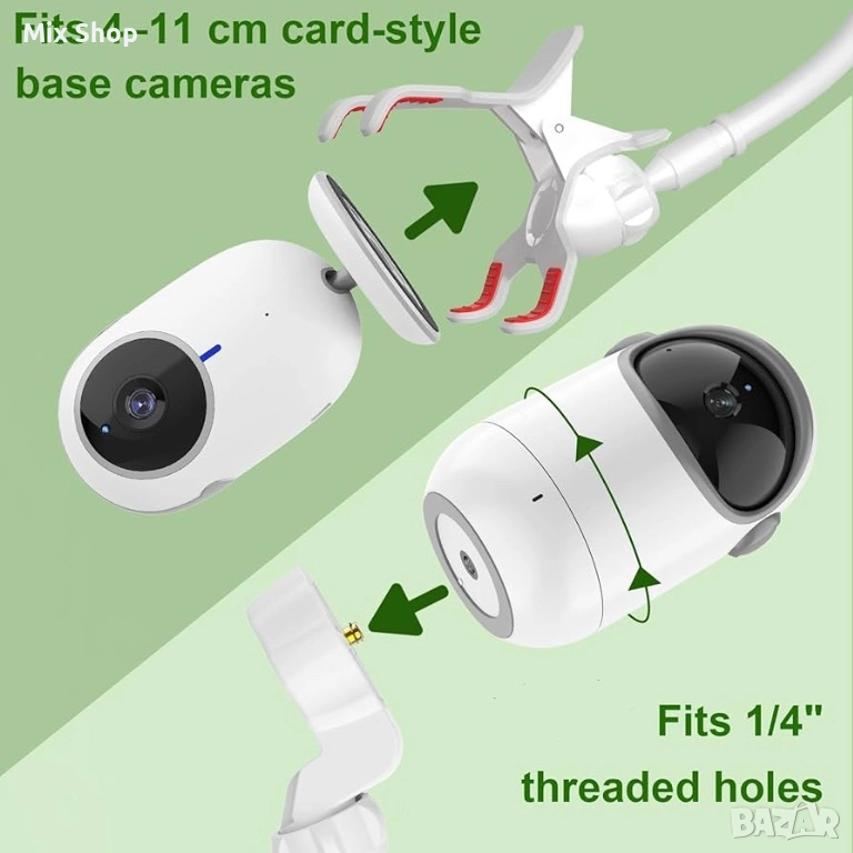 Универсална: Подходяща за камери с отвор за винт 1/4" или с основа (диаметър 4–11 см).