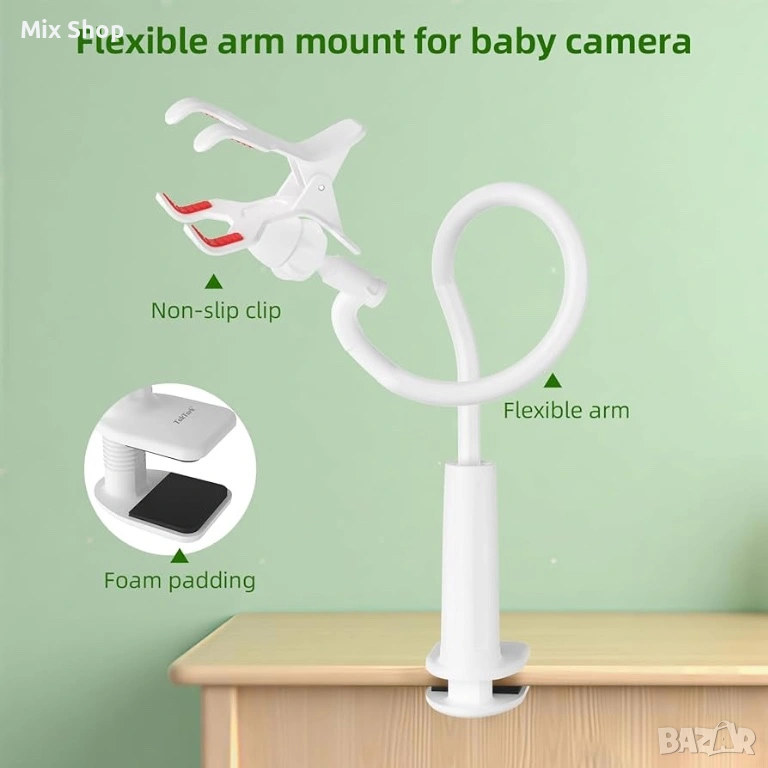 Нова универсална гъвкава стойка за бебефон TakTark - директен монтаж без дупчене