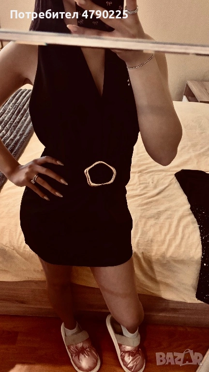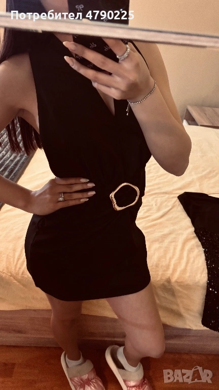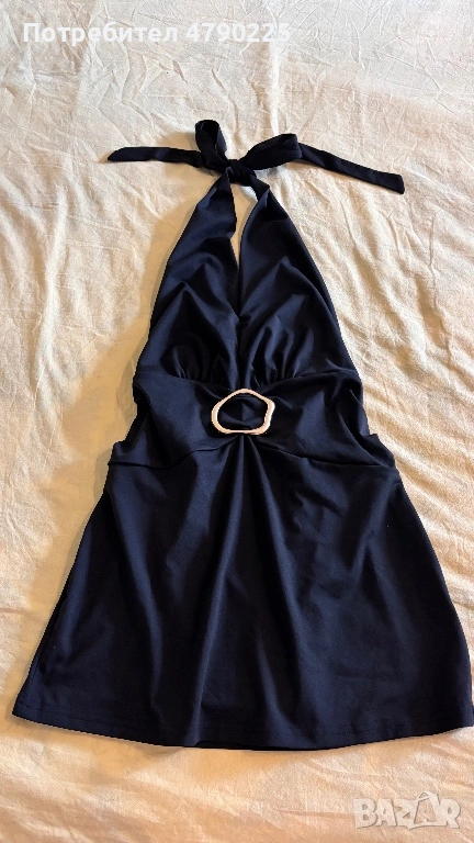 Елегантна черна рокля тип халтер. Моделът е с връзване зад врата и отворен гръб,облечена е един път. Има красив метален акцент отпред, който допълва визията. Материята е лека и падаща, много удобна за носене.