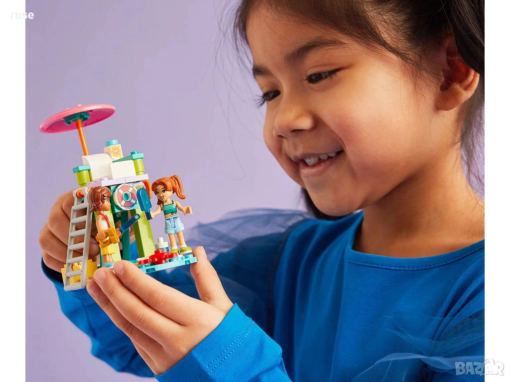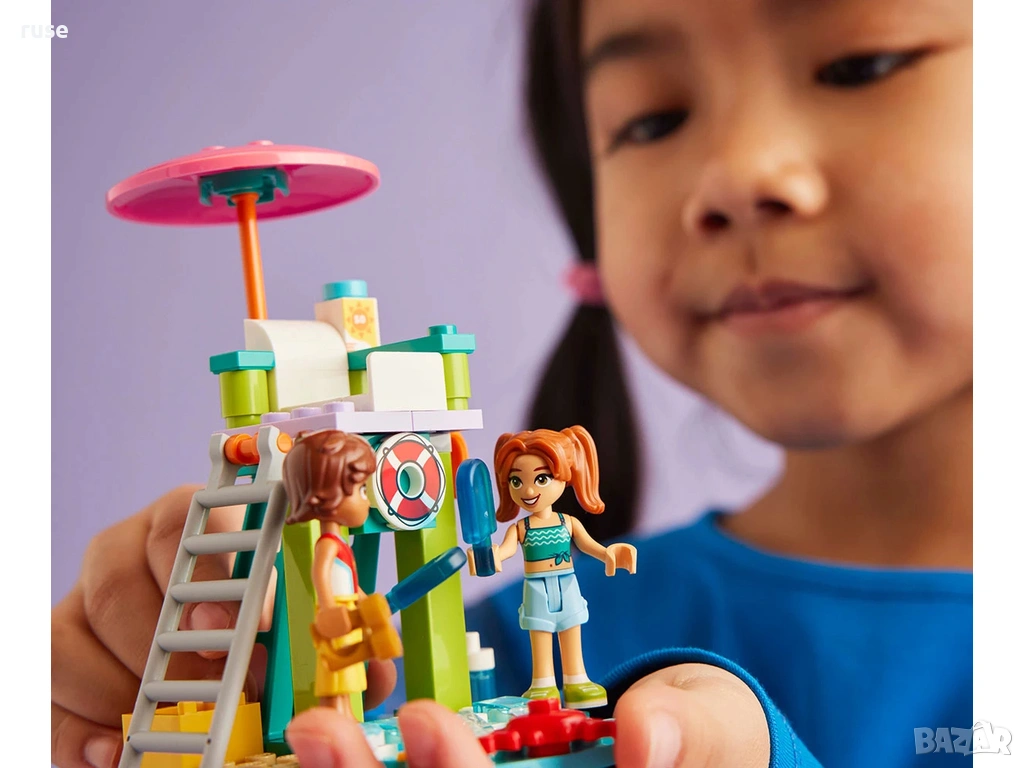 Строителен комплект със спасител с 2 миникукли и делфин – насърчете играта с въображение с тази играчка LEGO® Friends Плажен воден скутер за деца с включени аксесоари за ролева игра. Включва 2 водни скутера – с героите от LEGO® Friends Лео и Канди и 2 водни скутера, за да могат децата да създават много истории за приятелите на плажа на Хартлейк Сити.