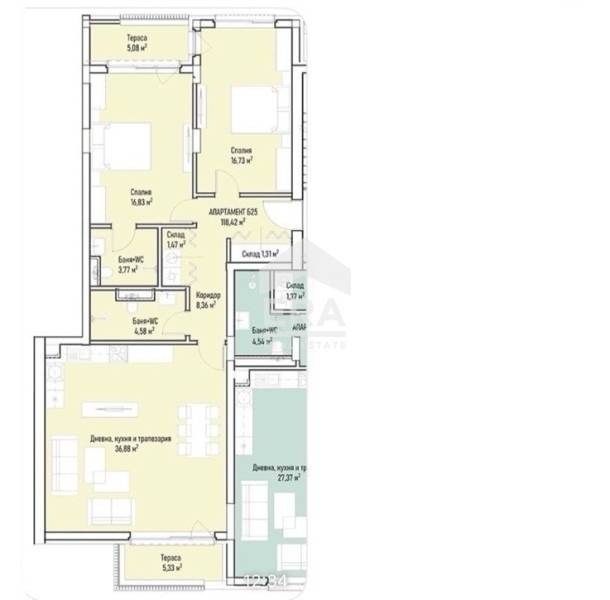 Имотът е с обща площ 147 кв.м. и застроена площ 118 кв.м., разположен е на 9-ти от 10 етажа и с две изложения - Север и Юг. Състои се от просторна и слънчева дневна с кухненска част и трапезария (с площ 37 кв.м.), две спални, две бани с тоалетна, коридор с обособено място за съхранение, мокро помещение, две тераси.