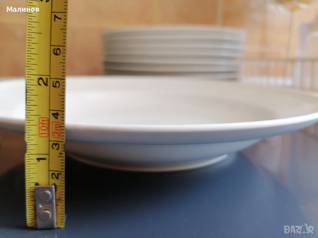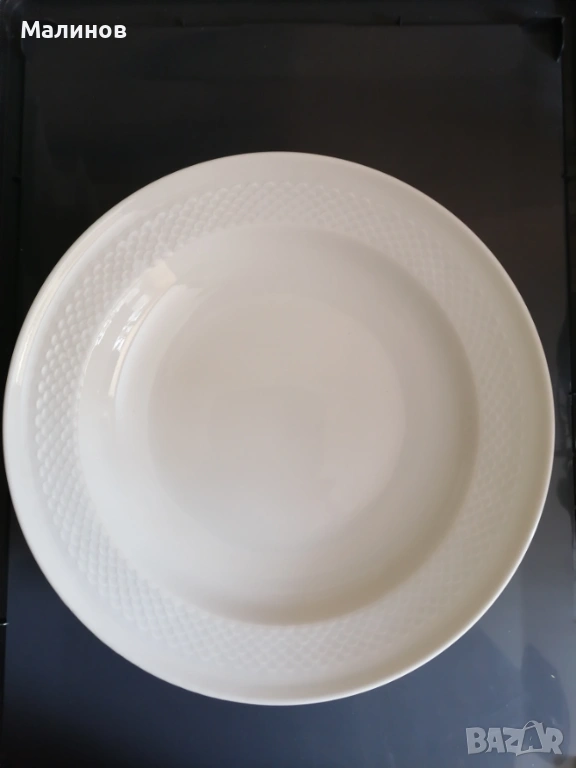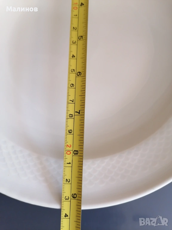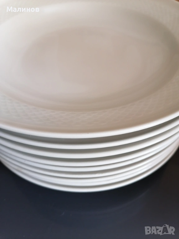 Чинии порцеланови, бели, релеф по борда под формата на рибни люспи. Диаметър 23,5 см, височина 3,6 см. Налични 9 броя, запазени, без забележки.