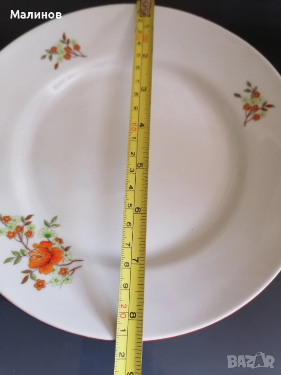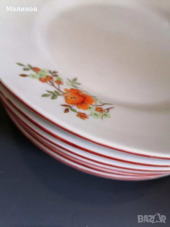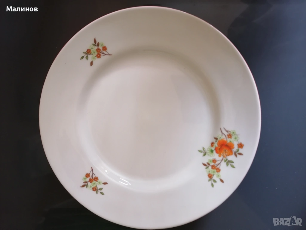 Чинии порцеланови, бели, гладки, с украса на цветчета по борда. Диаметър 19 см, височина 2,5 см. Налични 6 бр., запазени, без забележки.