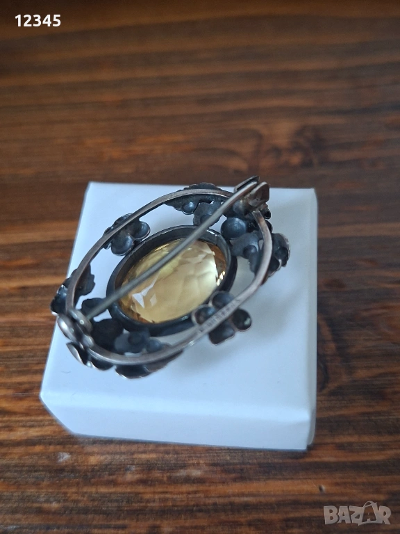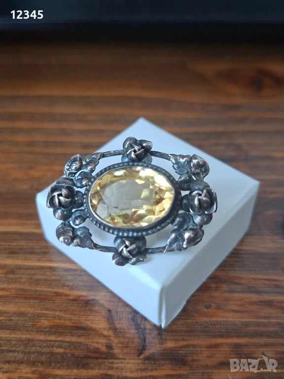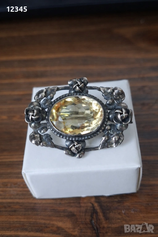 Стара сребърна брошка с флорални елементи и камък → Обява 54124438