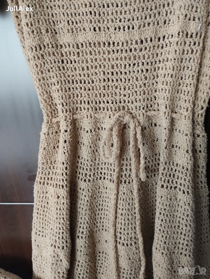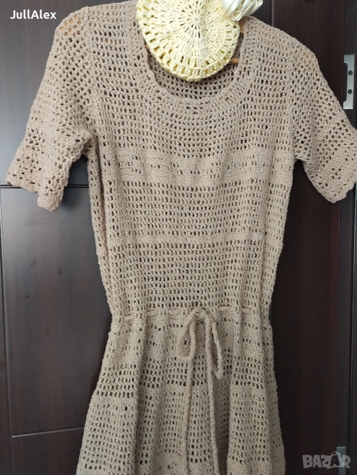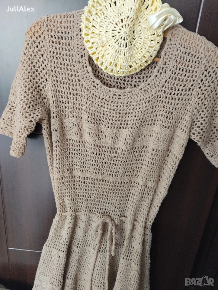 Ръчно плетена дамска рокля на една кука. Бежова прежда букле. Баретата също е на една кука- 39 €.