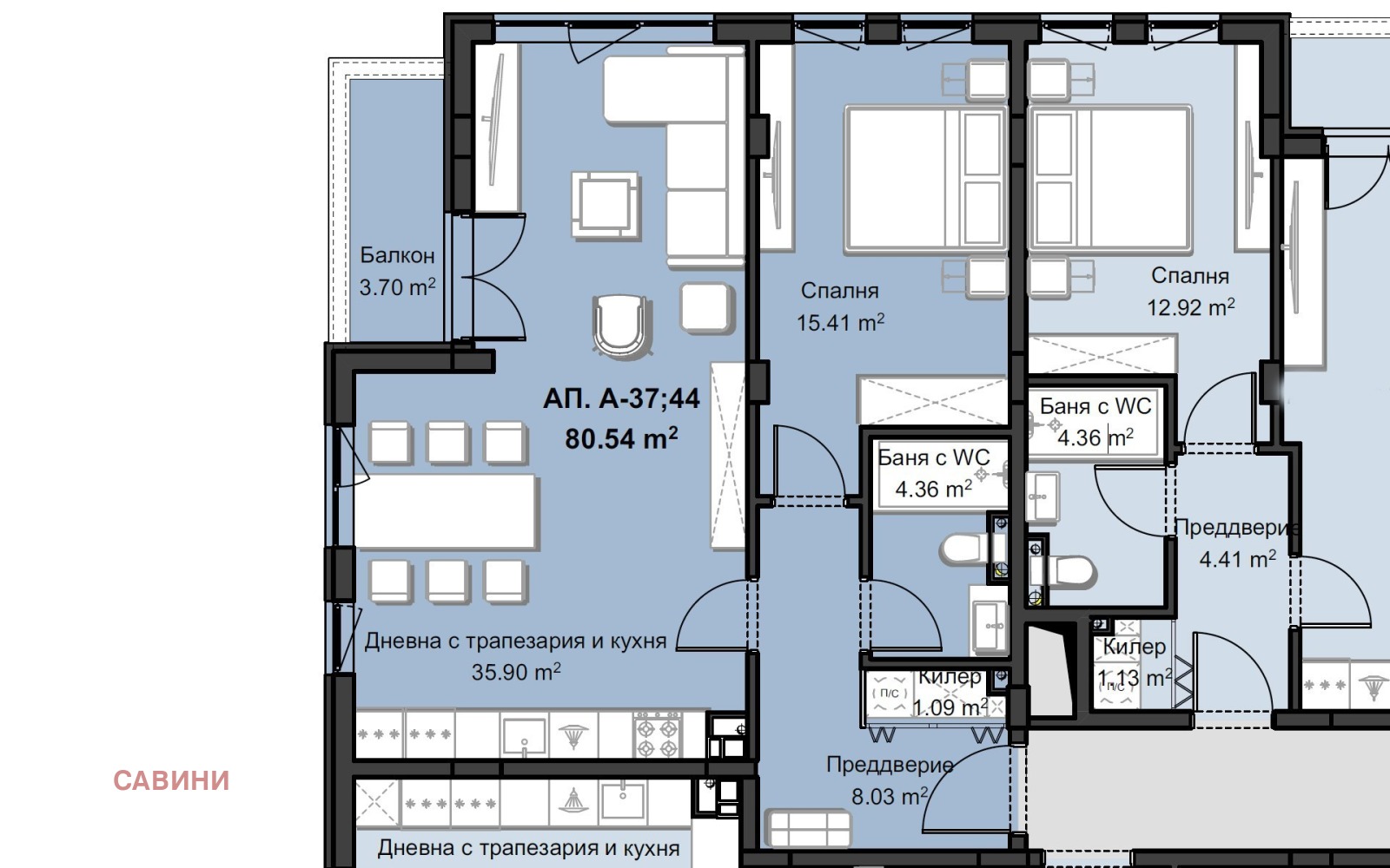 SAVINI продава двустаен апартамент в бутиков комплекс, състоящ се от антре, предверие, спалня, баня, всекидневна с кухня, тераса.