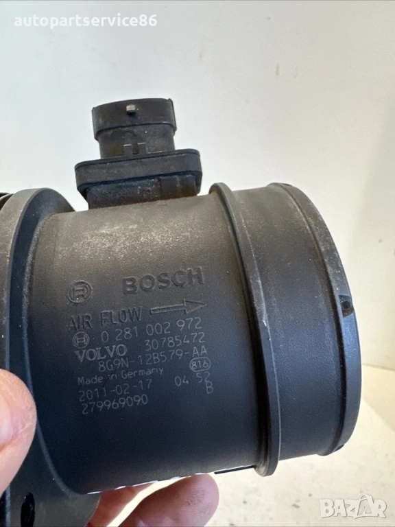 Дебитомер за въздушен поток LHD за Volvo V70 2.0 TDI 163HP (2012) 0281002972, снимка 1 - Части - 54124812 Дебитомер за въздушен поток LHD за Volvo V70 2.0 TDI 163HP (2012) 0281002972, снимка 2 - Части - 54124812 1/2