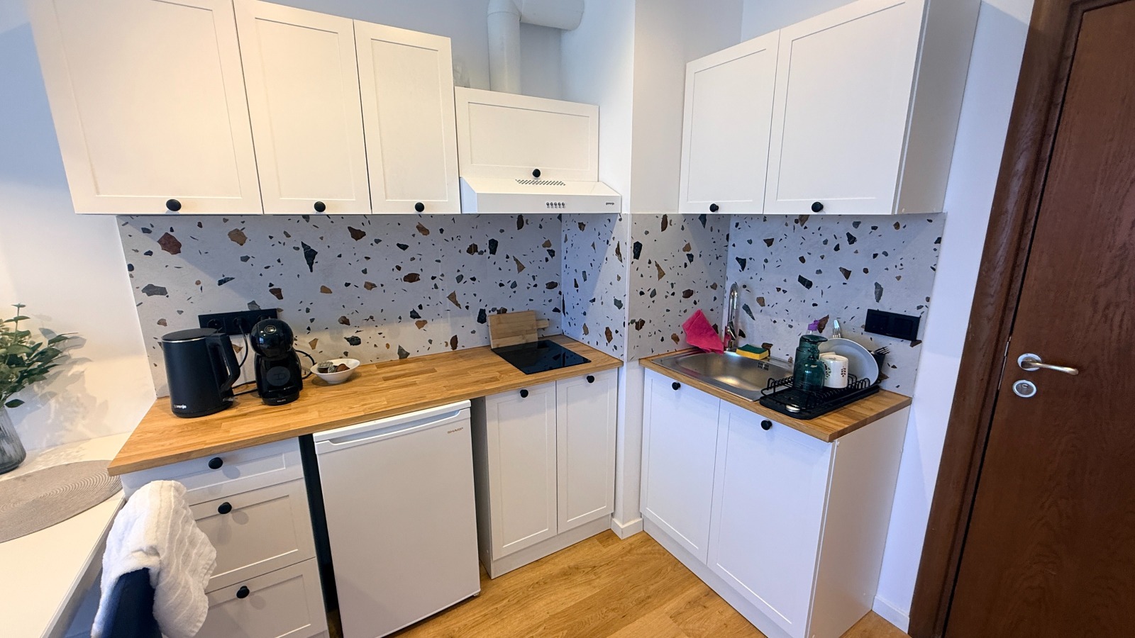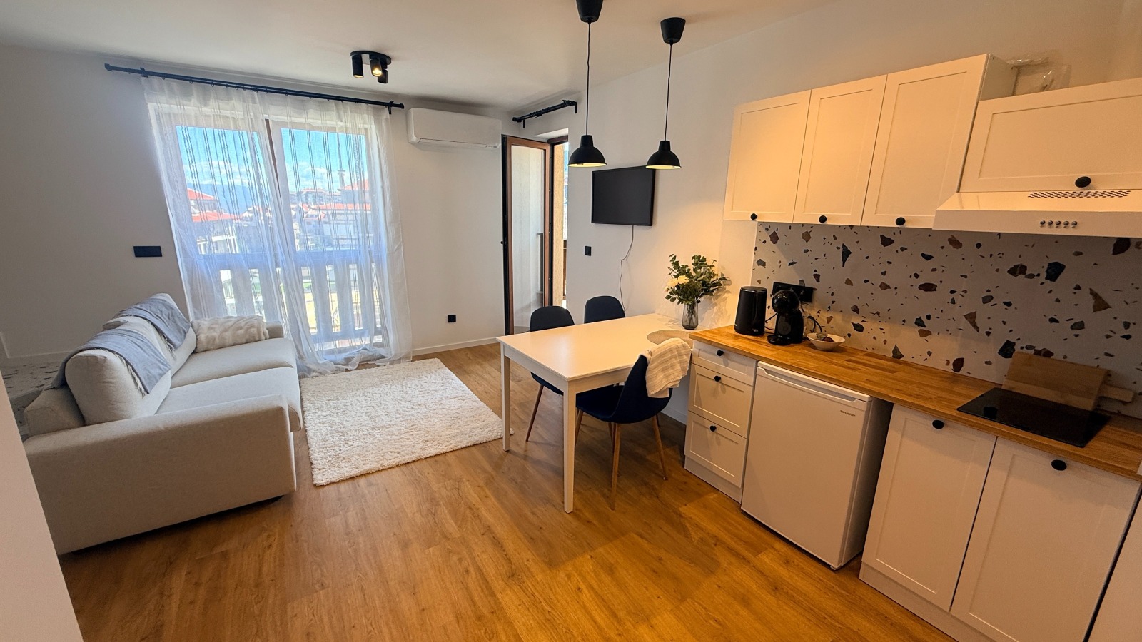 Светъл и приветлив хол с напълно оборудван кухненски ъгъл.