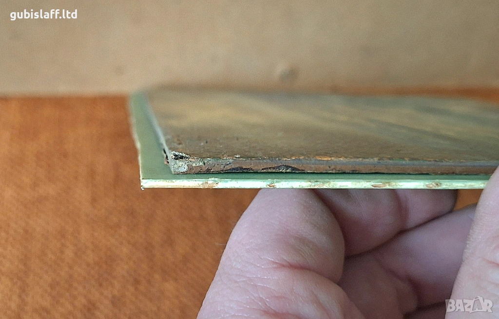 Маслени бои върху дебел, пресован картон с грапава повърхност, картонът е залепен върху плексиглас.