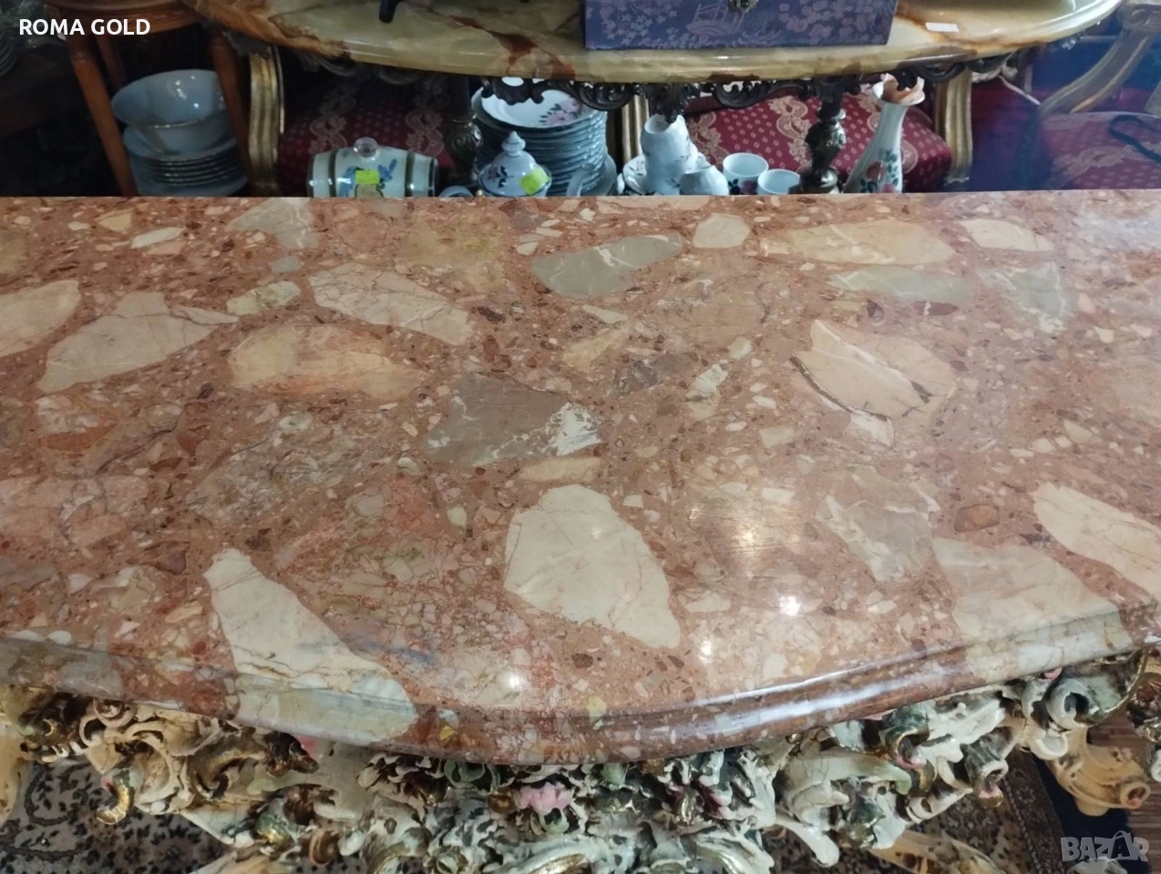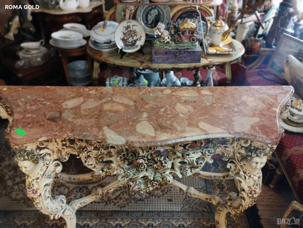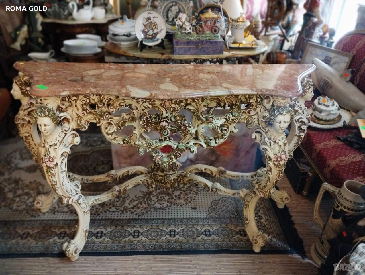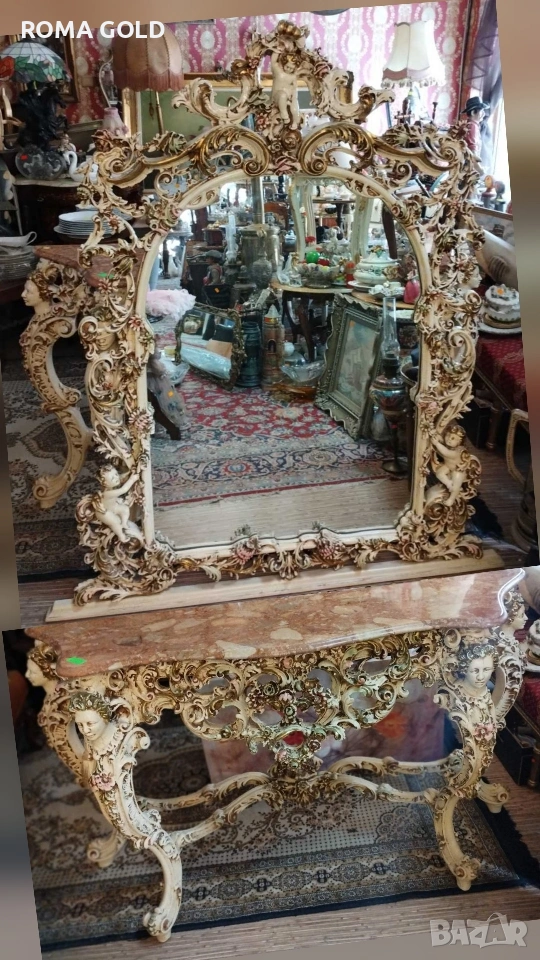 Антикварна, изящна италианска конзола с огледало в бароков/ венециански стил. Изработена е от дърво с позлата, богато резбовани орнаменти, включващи ангелски фигури. Плота е от масивен розов мрамор. Идеална мебел за ценителите на класическия лукс. РАЗМЕРИ НА ОГЛЕДАЛОТО: Височина 156см Ширина 135см Само огледалната част: Височина 106см Ширина 76см Ширина долу 4см, с ангелите 8см, най- горната част 11см. РАЗМЕРИ НА КОНЗОЛАТА: Височина 92см Дължина 154см Ширина 42см Ширина на мрамора 144см Цена: 1950 евро