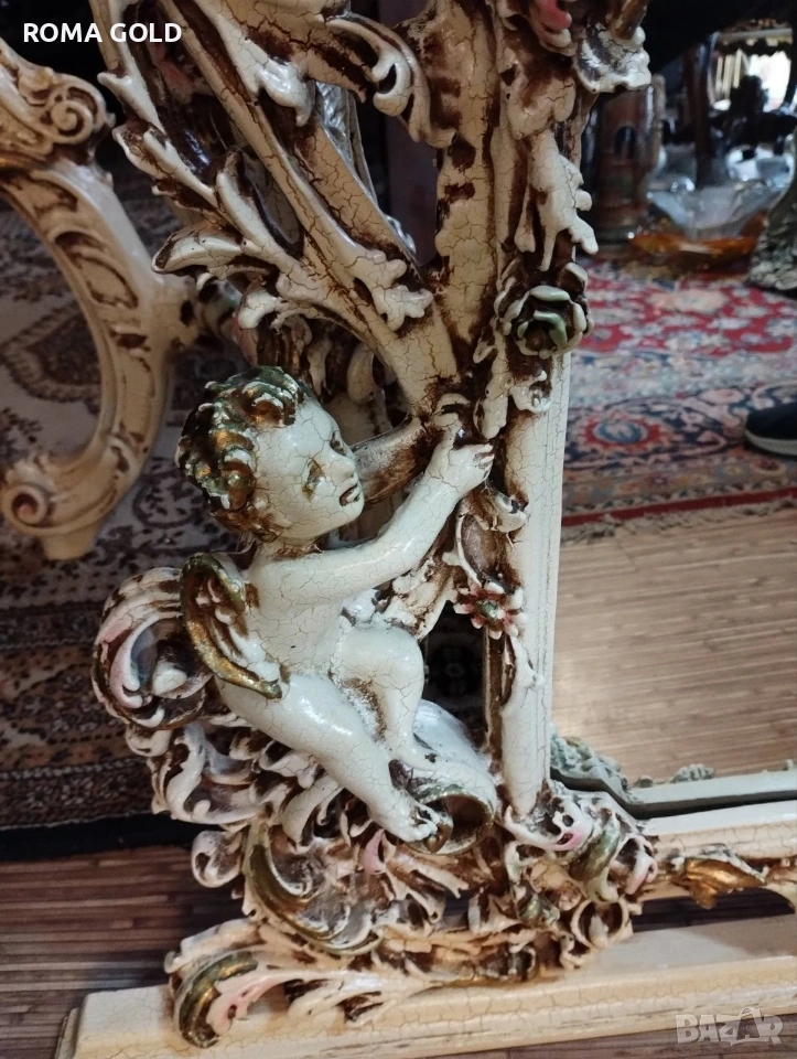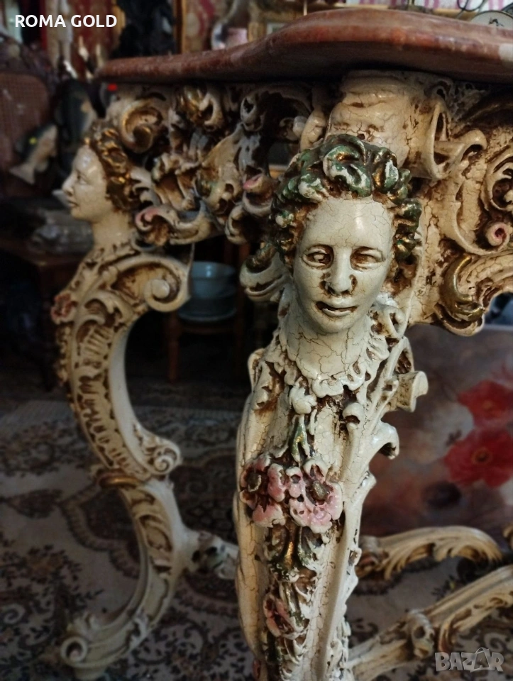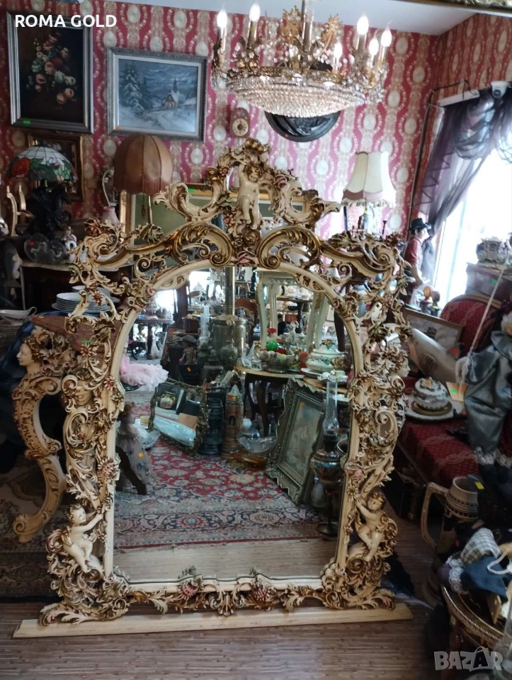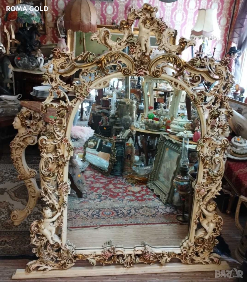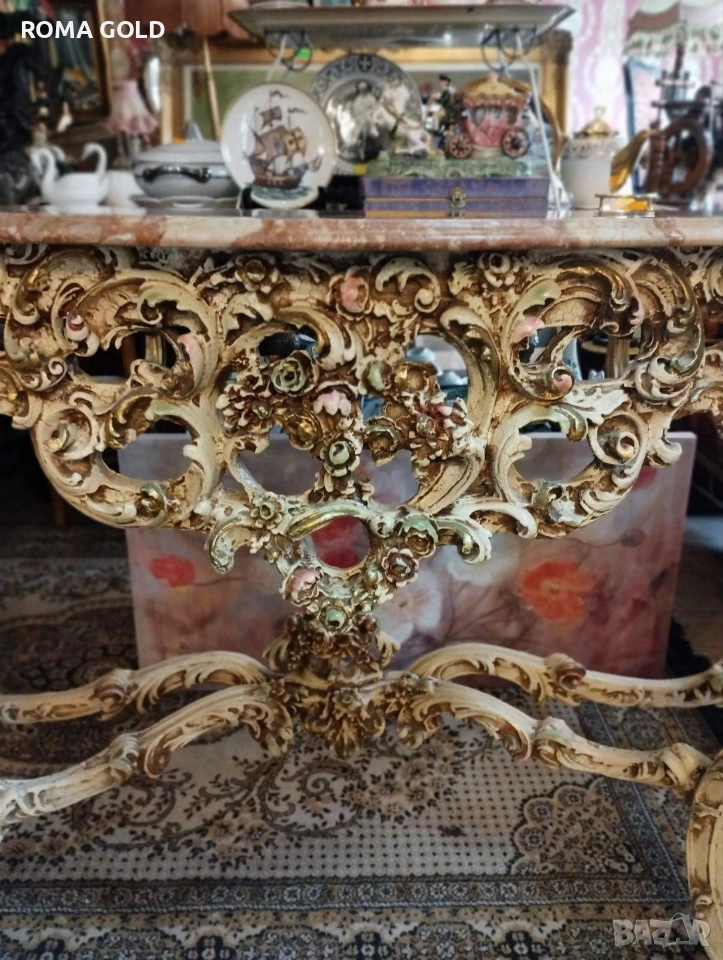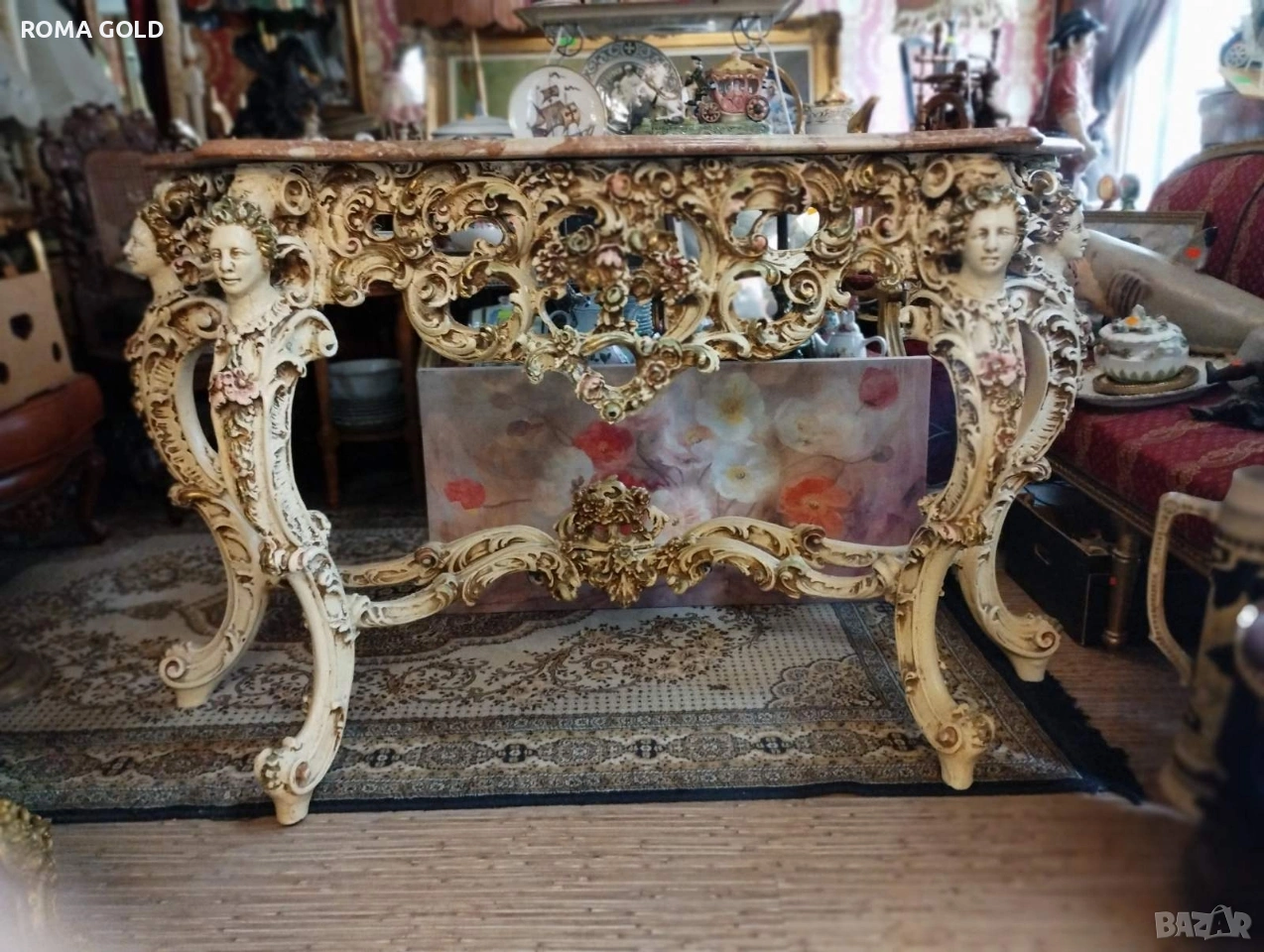 Антикварна, изящна италианска конзола с огледало в бароков/ венециански стил. Изработена е от дърво с позлата, богато резбовани орнаменти, включващи ангелски фигури. Плота е от масивен розов мрамор. Идеална мебел за ценителите на класическия лукс. РАЗМЕРИ НА ОГЛЕДАЛОТО: Височина 156см Ширина 135см Само огледалната част: Височина 106см Ширина 76см Ширина долу 4см, с ангелите 8см, най- горната част 11см. РАЗМЕРИ НА КОНЗОЛАТА: Височина 92см Дължина 154см Ширина 42см Ширина на мрамора 144см Цена: 1950 евро