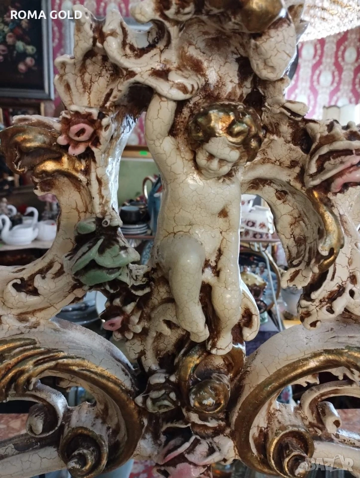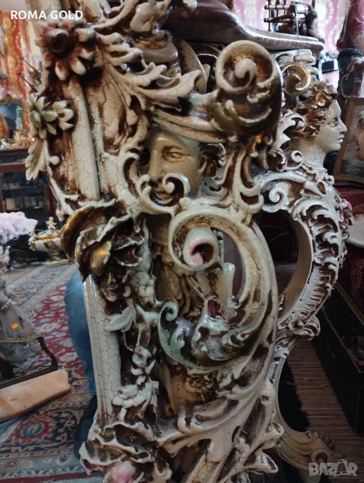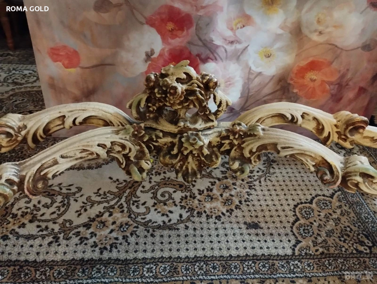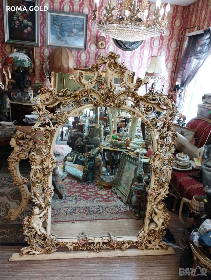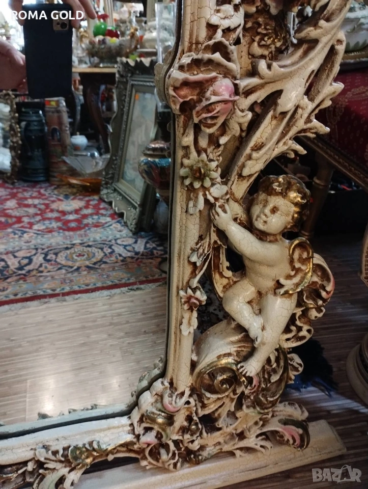Антикварна, изящна италианска конзола с огледало в бароков/ венециански стил. Изработена е от дърво с позлата, богато резбовани орнаменти, включващи ангелски фигури. Плота е от масивен розов мрамор. Идеална мебел за ценителите на класическия лукс. РАЗМЕРИ НА ОГЛЕДАЛОТО: Височина 156см Ширина 135см Само огледалната част: Височина 106см Ширина 76см Ширина долу 4см, с ангелите 8см, най- горната част 11см. РАЗМЕРИ НА КОНЗОЛАТА: Височина 92см Дължина 154см Ширина 42см Ширина на мрамора 144см Цена: 1950 евро