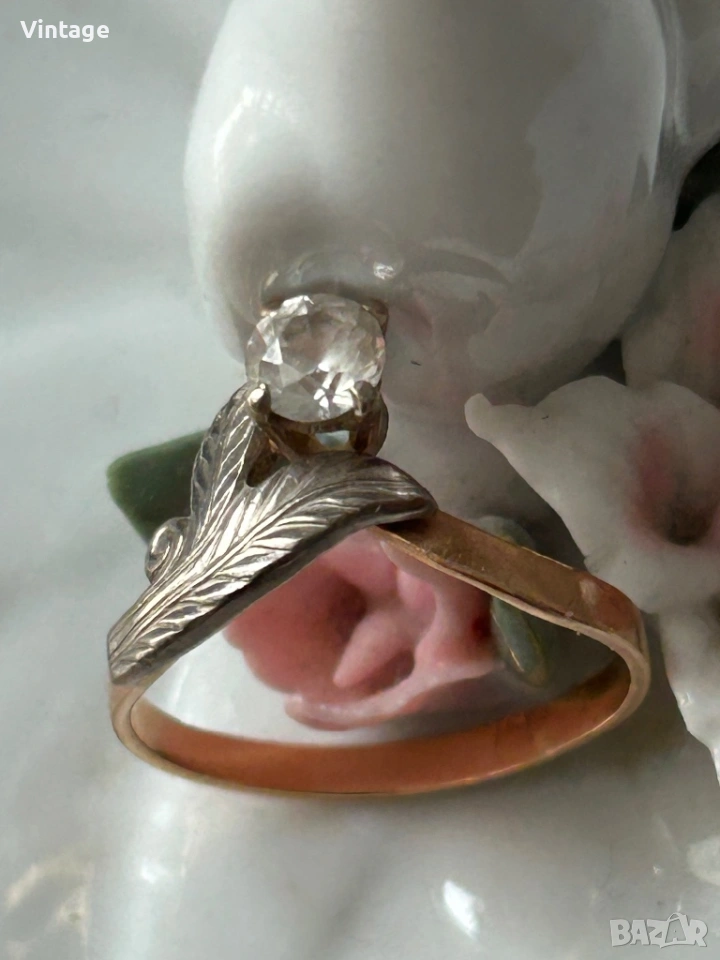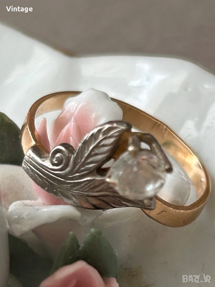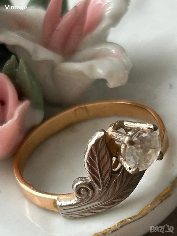 Антикварен златен съветски пръстен . Изключително красив и интересен, изработен от червено и бяло злат с бял топаз . Има всички необходими стари съветски вдлъбнати маркировки за злато проба 583 /14к. и произход. Ясно се виждат. Размер на пръстена 17мм. тегло 2,70гр. Отлично състояние. Бижу за винтидж любители и ценители. Изпращам с преглед тест.