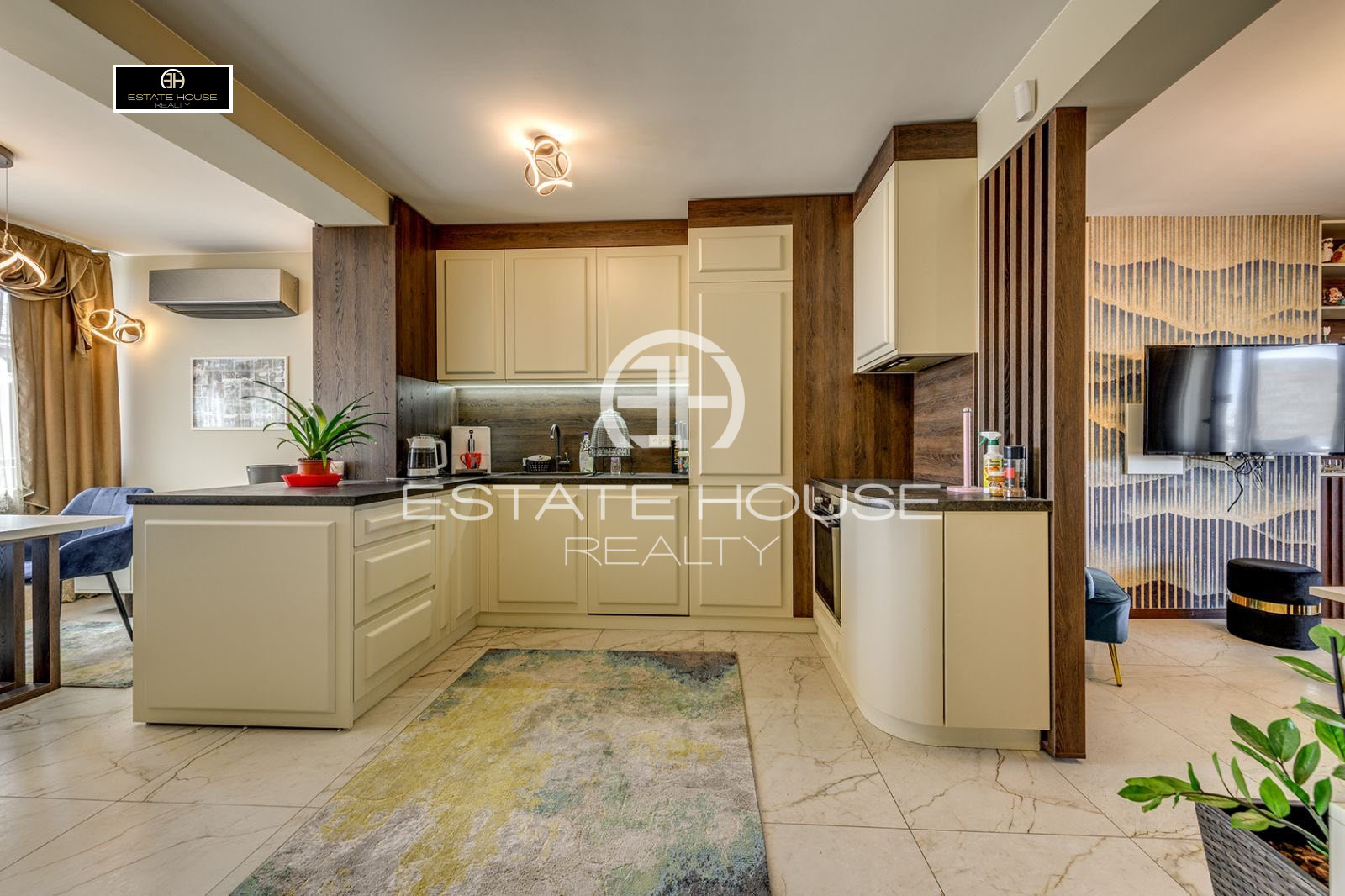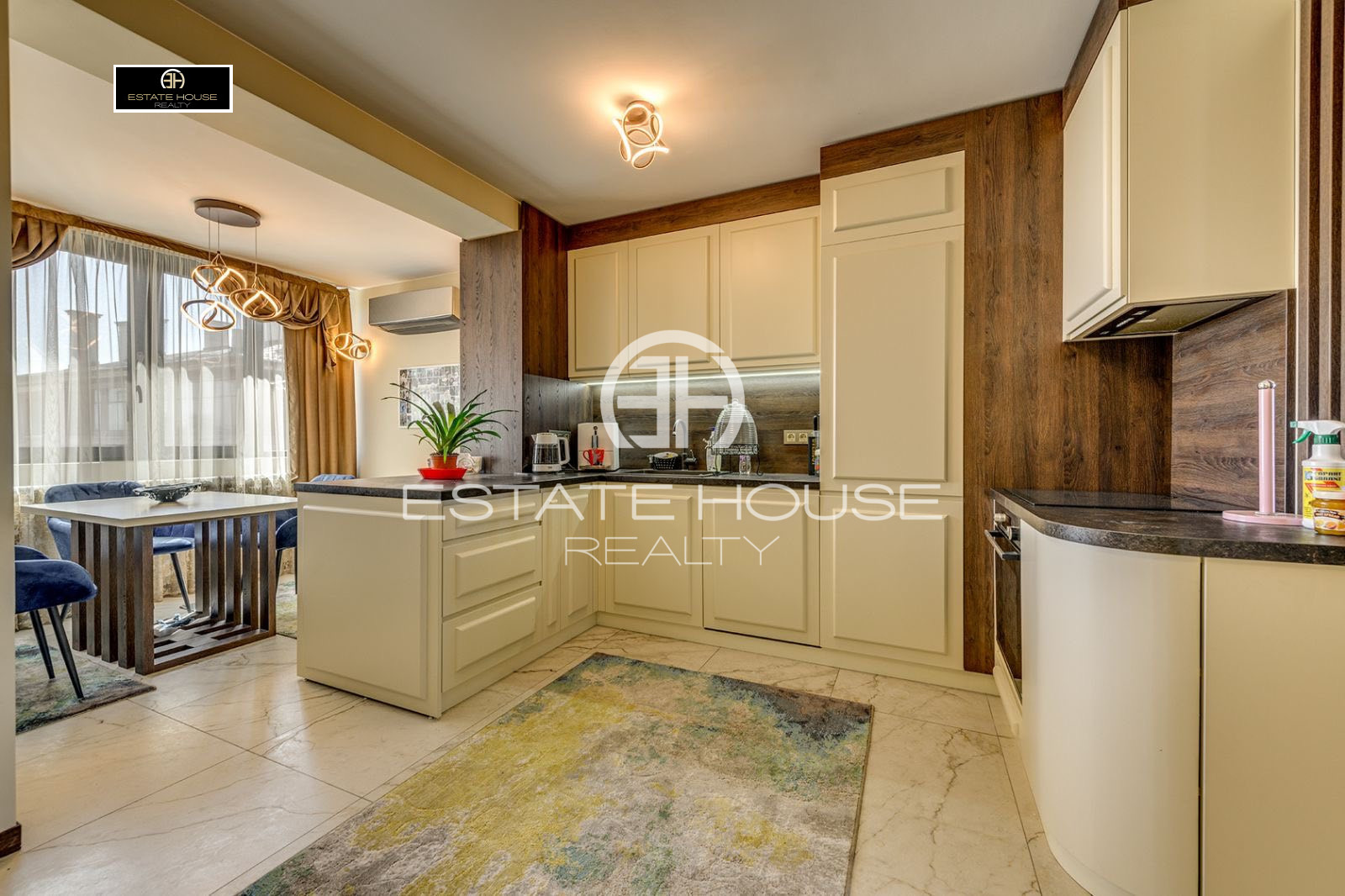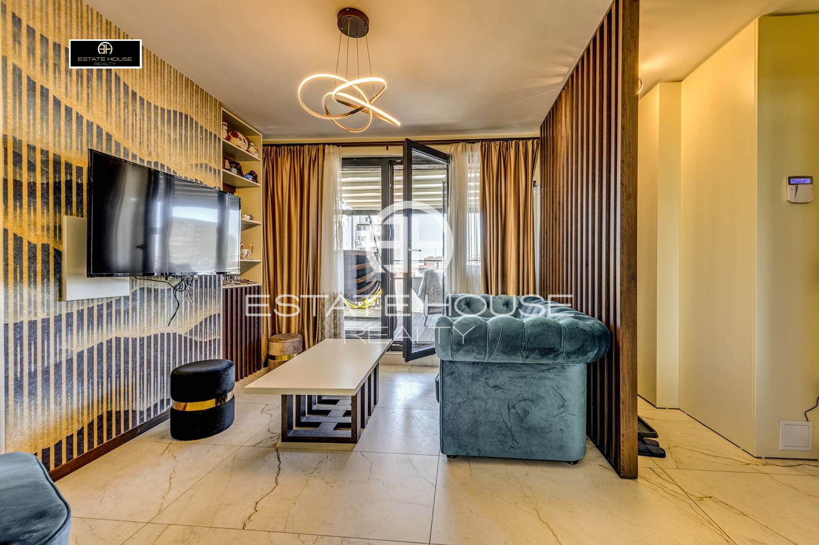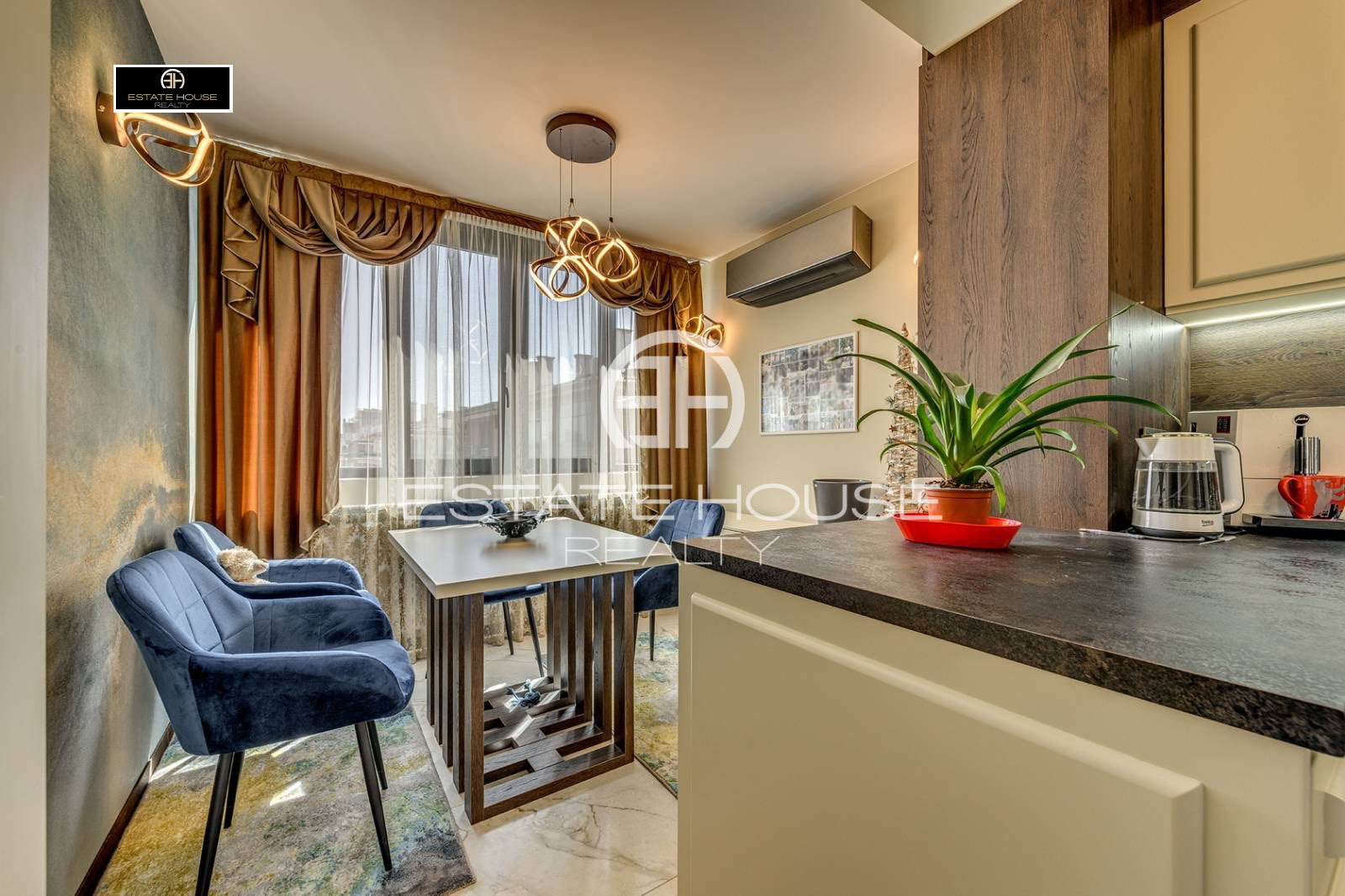 Апартаментът се отдава напълно обзаведен и оборудван с висок клас мебели и електроуреди, изпълнен по дизайнерски проект с внимание към всеки детайл. Използвани са уреди на водещи марки, висококачествени материали, естествени настилки и ръчно изработени елементи, като интериорът съчетава стил, функционалност и уют.