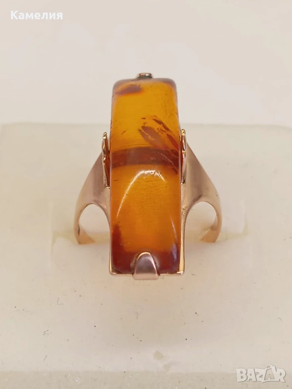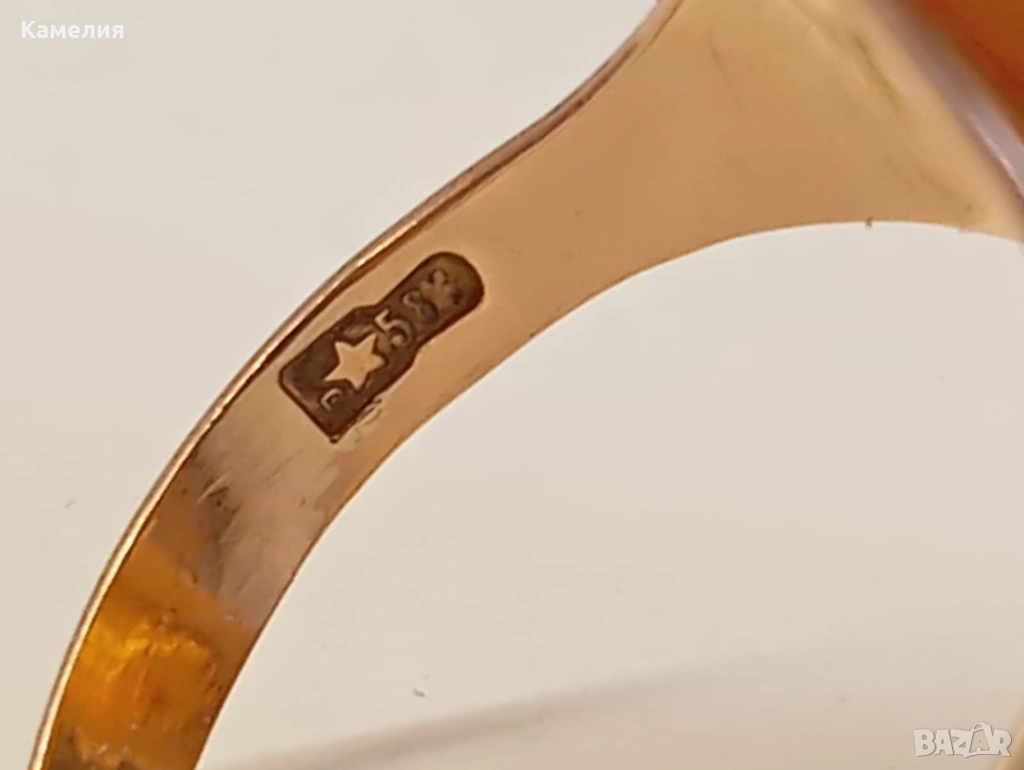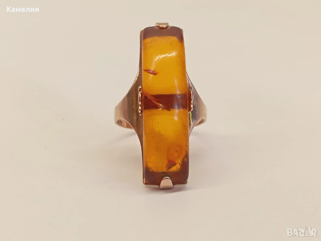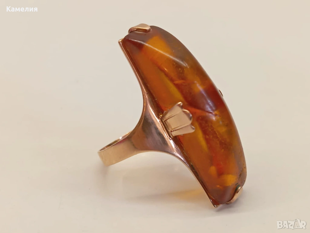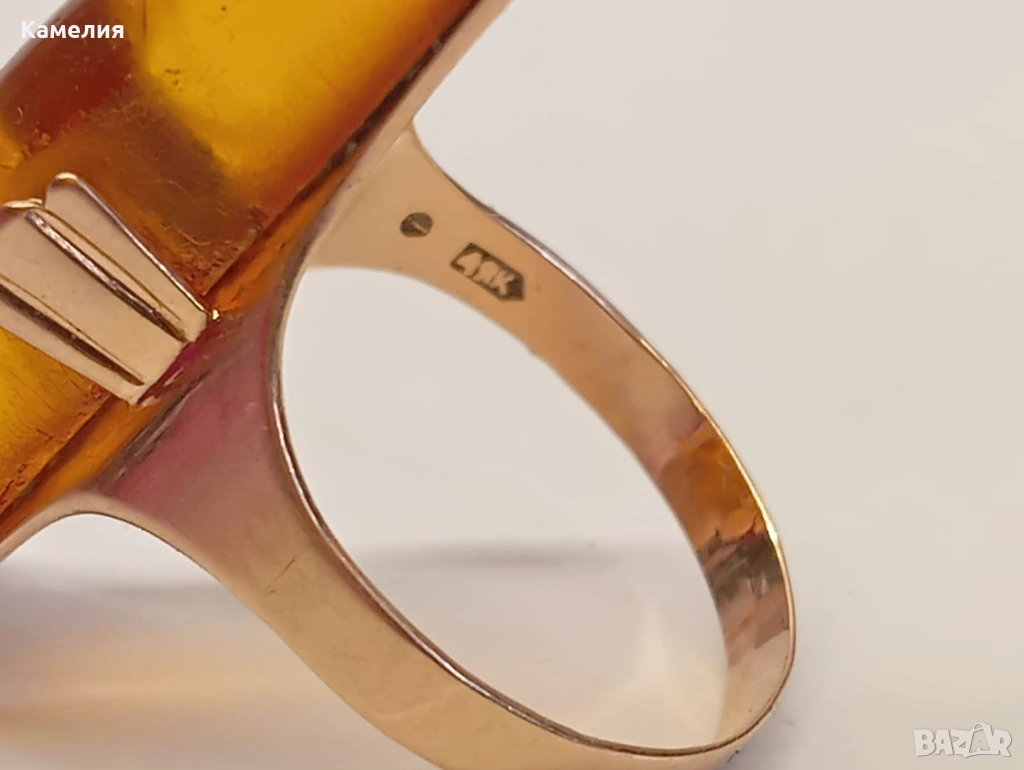 Руски (съветски) златен винтидж пръстен с кехлибар. Проба 583 звезда. Калининград. Грамаж 4,3 грам. Диаметър 17,5-18 мм. Дължина на пръстена 30 мм.
