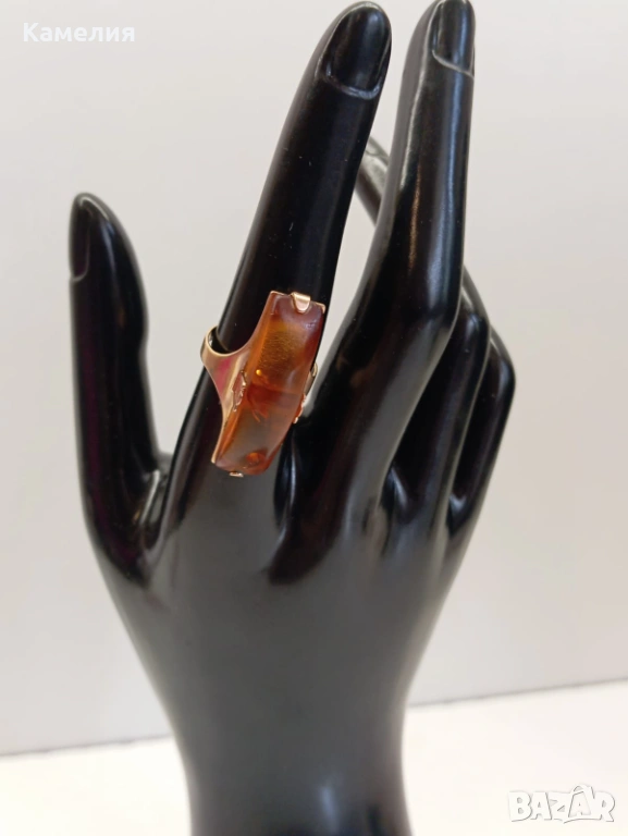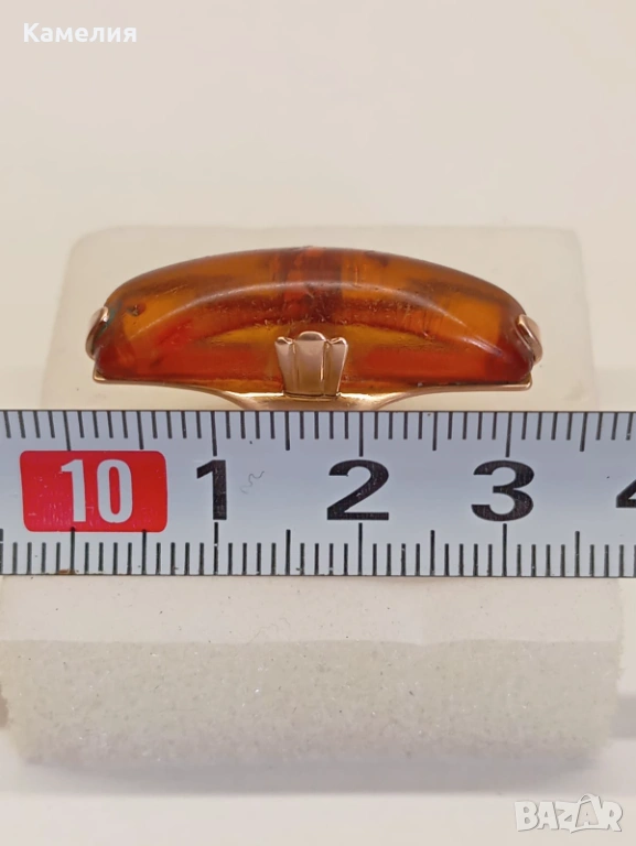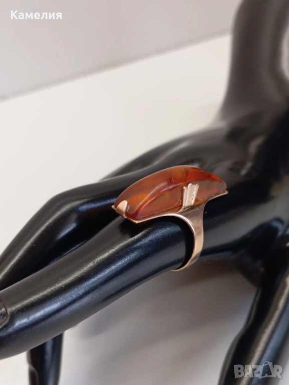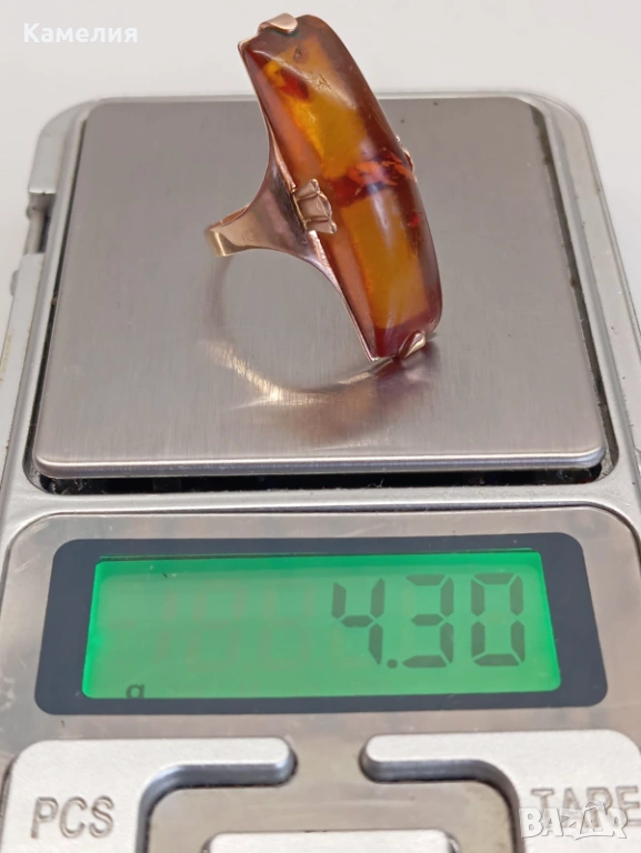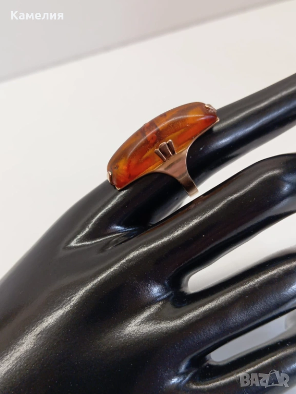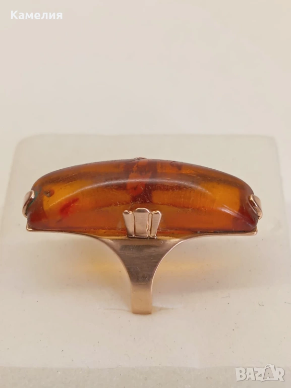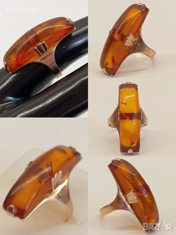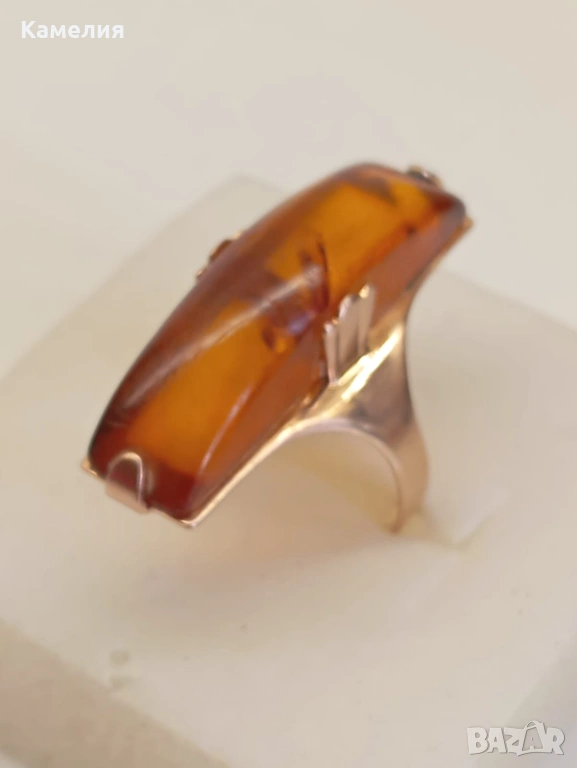 Руски (съветски) златен винтидж пръстен с кехлибар. Проба 583 звезда. Калининград. Грамаж 4,3 грам. Диаметър 17,5-18 мм. Дължина на пръстена 30 мм.