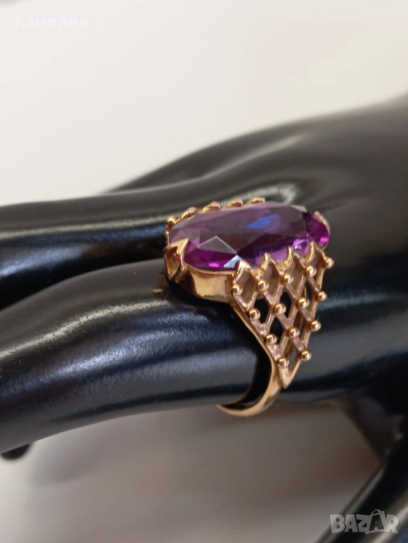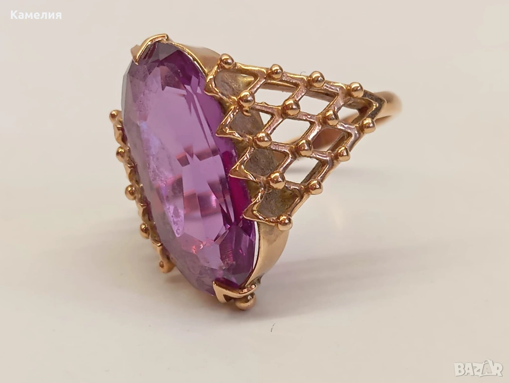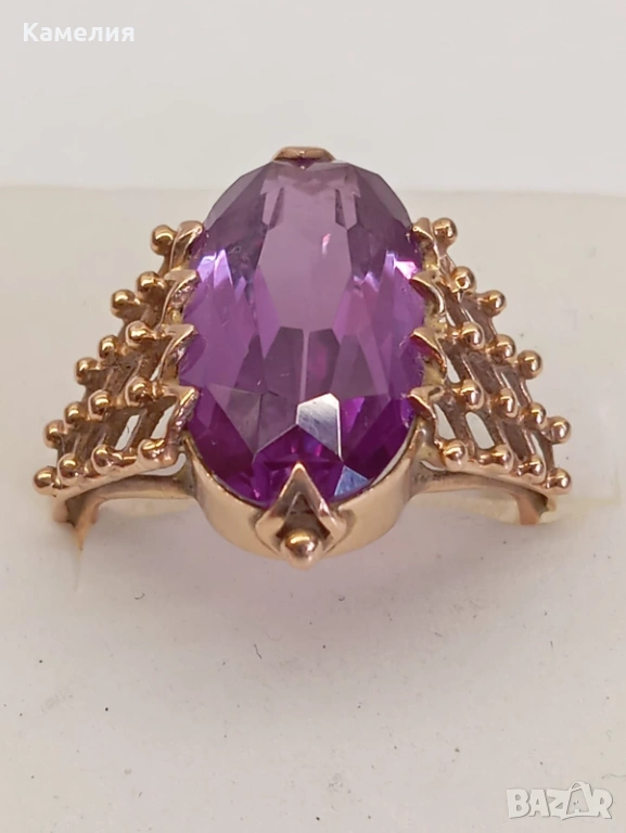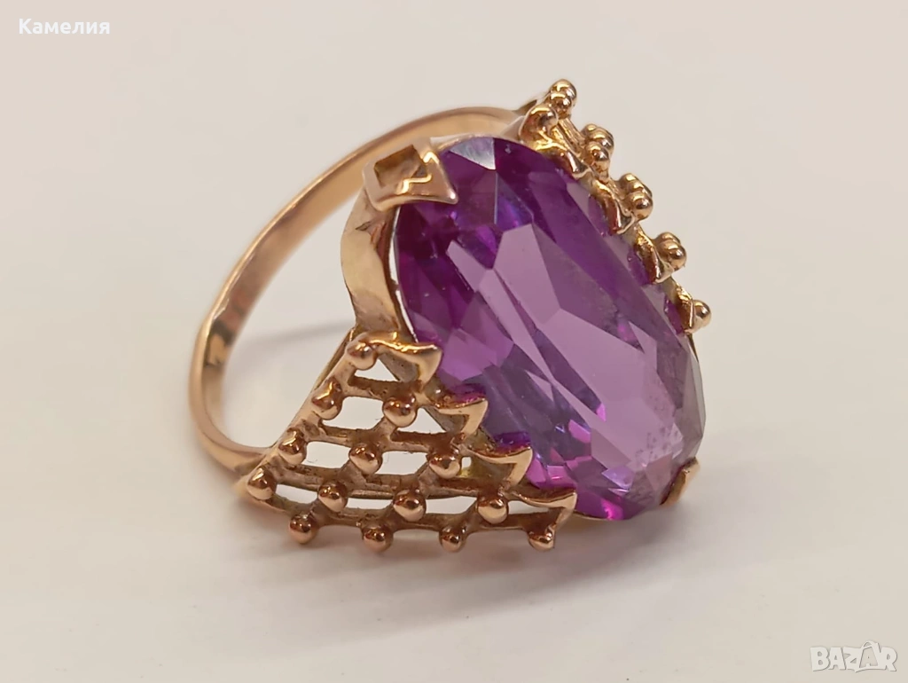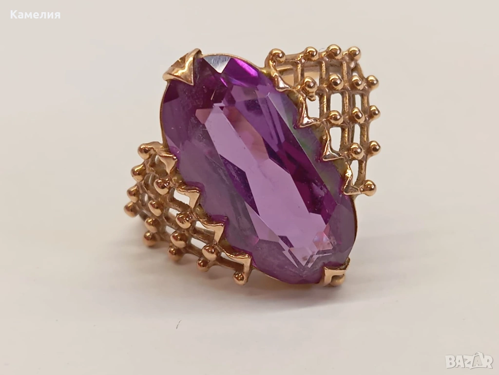 Красив руски (съветски) златен винтидж масивен пръстен с лабораторен александрит. Проба звезда 583. Рига, 1971г. Рядък е. Грамаж 6,96 грам. Диаметър 20 мм.