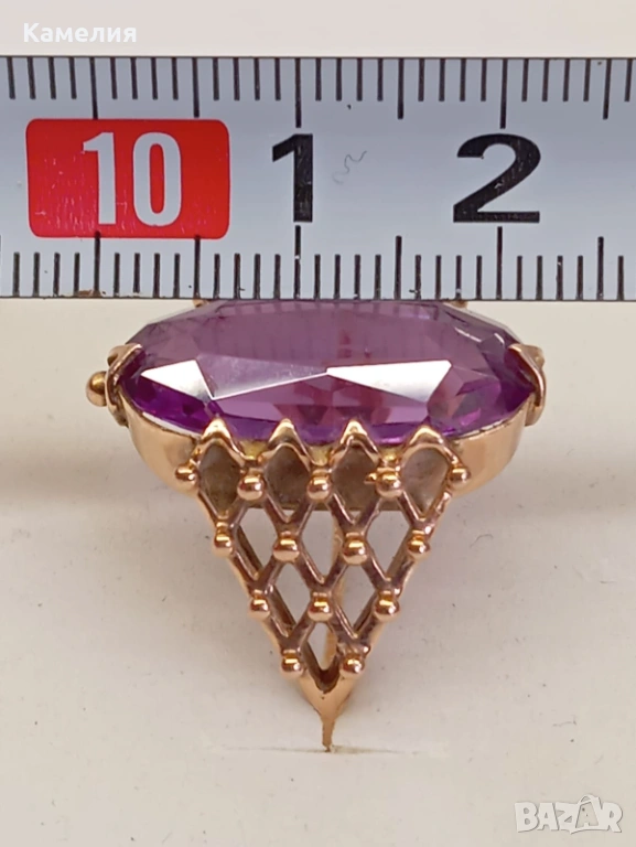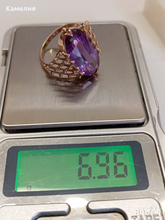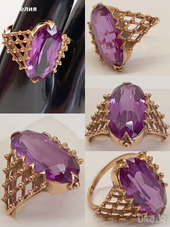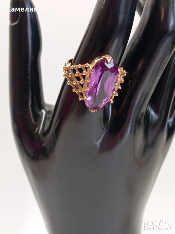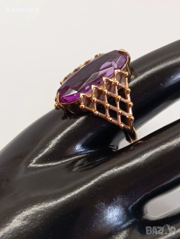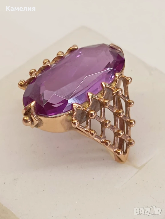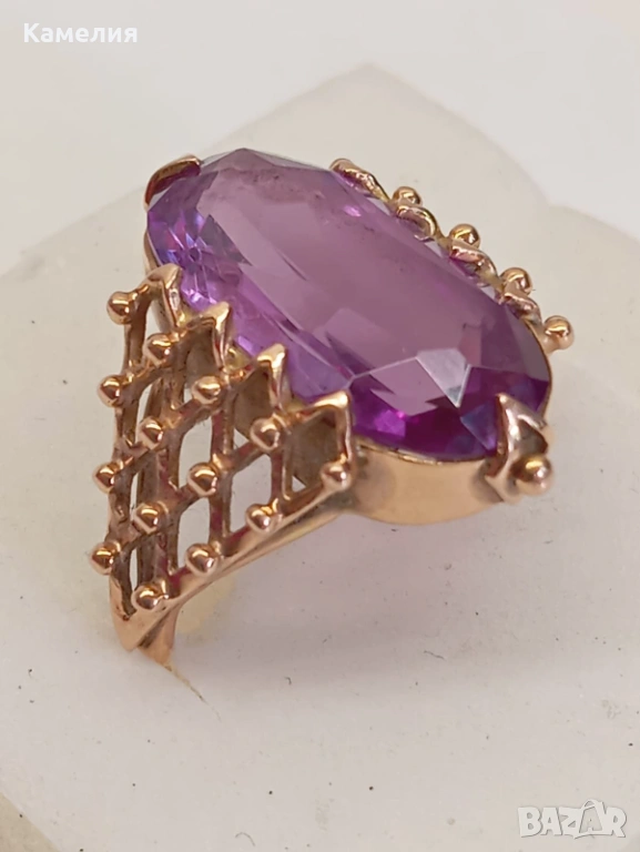 Красив руски (съветски) златен винтидж масивен пръстен с лабораторен александрит. Проба звезда 583. Рига, 1971г. Рядък е. Грамаж 6,96 грам. Диаметър 20 мм.
