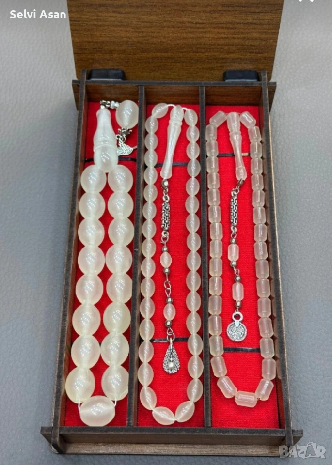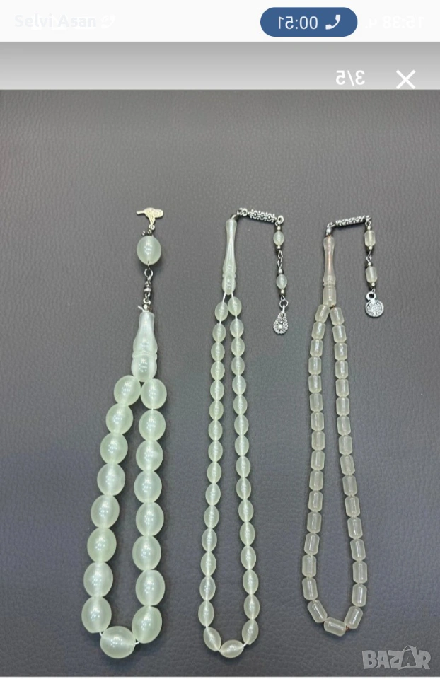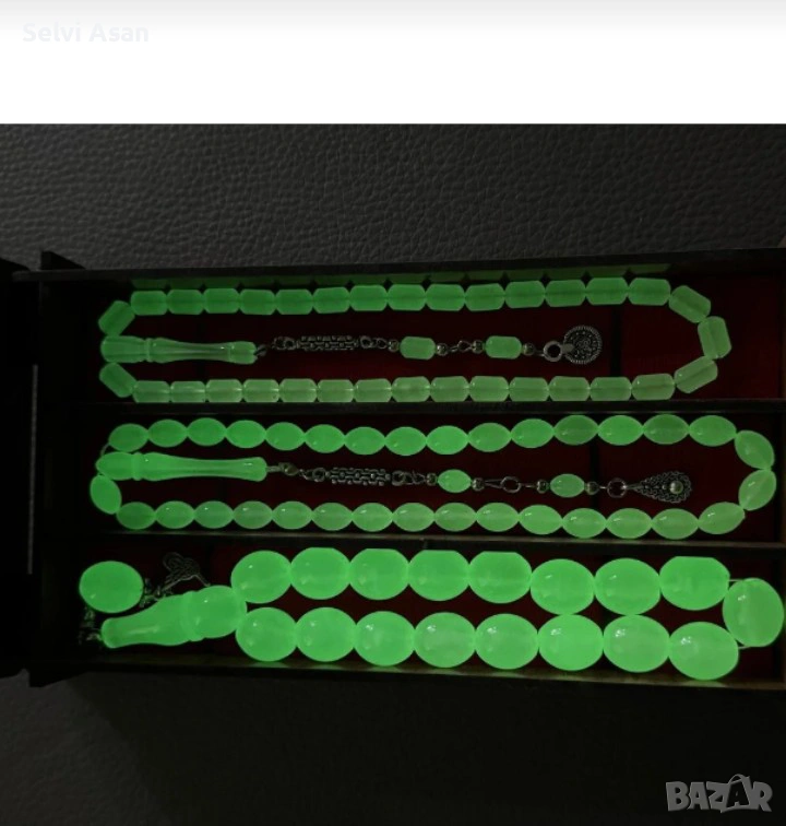 Светещи броеници / Tesbih – луксозен комплект Елегантен комплект от 3 броя светещи броеници, изработени от материал с ефект Glow in the Dark. През деня абсорбират светлина, а на тъмно излъчват впечатляващо ярко зелено сияние, което ги прави изключително атрактивни и различни. Подходящи както за ежедневна употреба, така и за подарък, колекция или специален повод. Всяка броеница е с красив завършек, декоративни метални елементи и стилна визия, която съчетава традиция и модерен ефект. Характеристики: Комплект: 3 броя Ефект: светещи в тъмното Цвят: неоново зелено / млечно зелено Материал: фосфоресциращ акрил / смола (според модела) Подходящи за: подарък, колекция, ежедневна употреба Дизайн: елегантен и впечатляващ