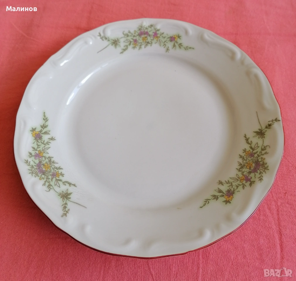 Чинии порцеланови, плитки, бели, с релефни орнаменти и с украса на цветчета по борда. Диаметър 20,5 см. Налични 4 бр., запазени, без забележки.