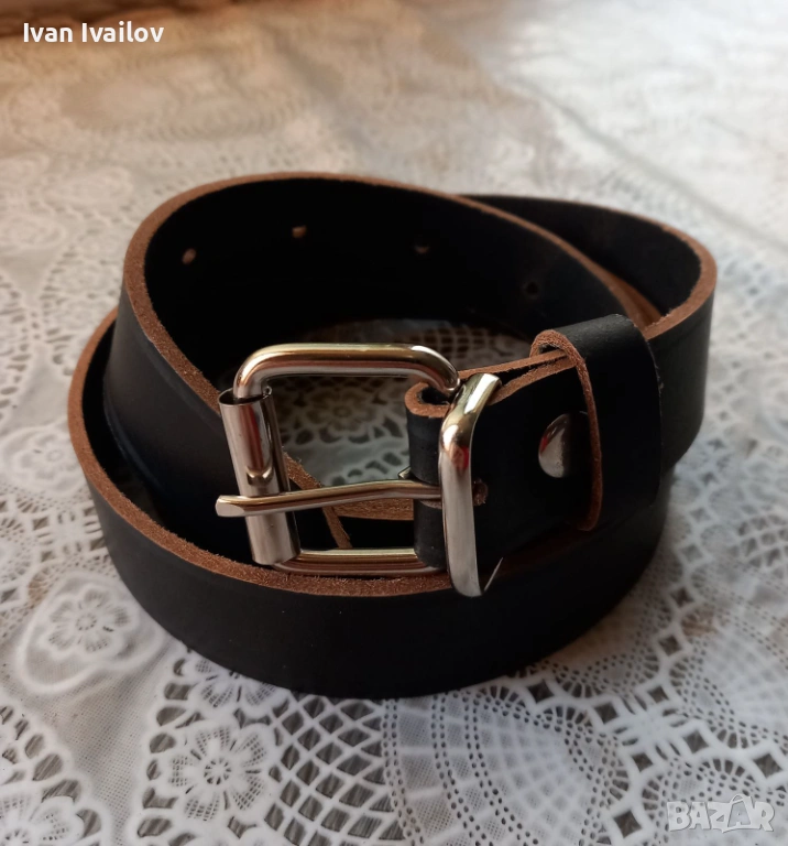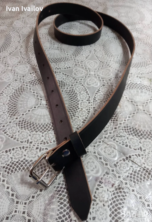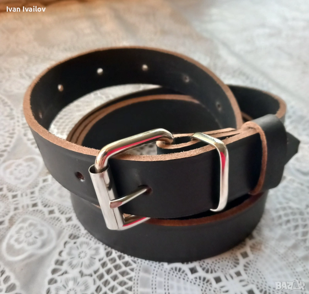 Продавам ръчно изработен мъжки колан от плътна естествена кожа. Моделът е с ширина 3 см, което го прави изключително подходящ за официални панталони, костюми или за по-фини дънки. Светлият ръб (кант) подчертава занаятчийския характер и автентичността на кожата.