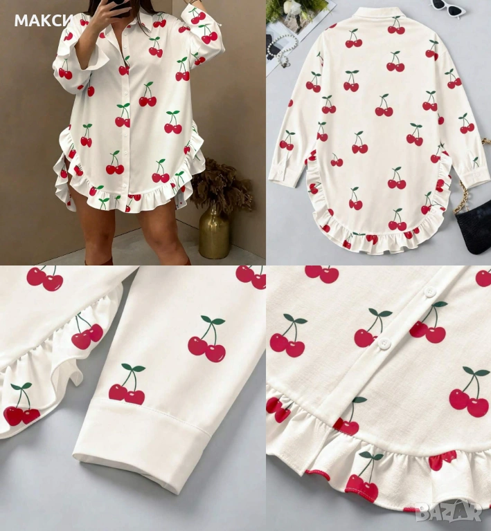 Разкошна макси модерна ефирна дълга риза с извивки и къдрички в бяло с черешки - лека и комфортна ма → Обява 54126973