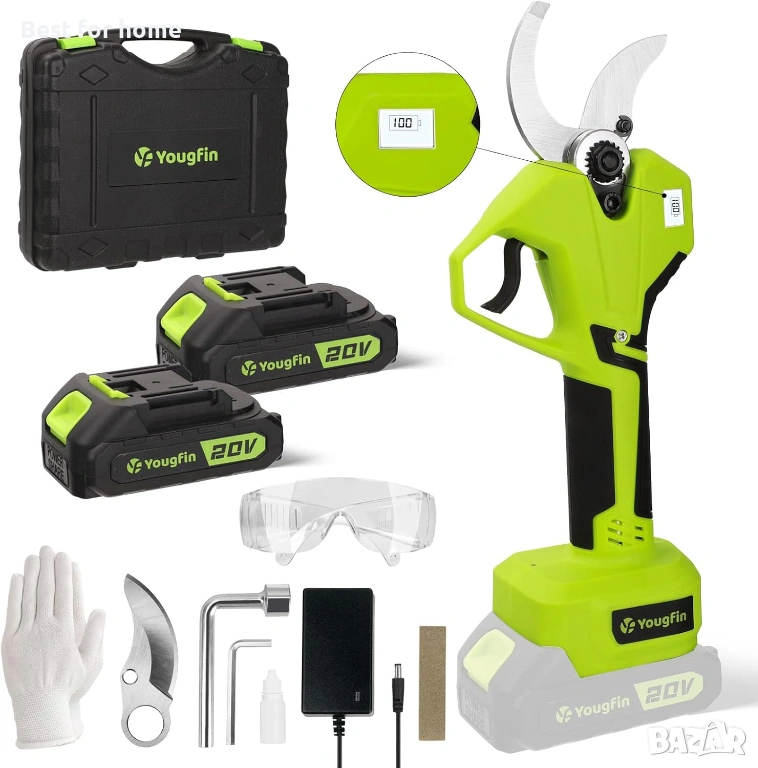 Електрически ножици за клони YOUGFIN 40 мм (1,6 инча), Безжични ножици за клони, тежки, с LCD дисплей, 20V електрически ножици, безчеткови за градинарство, ножици за клони с батерии с остриета SK5 (2 * 2,0 Ah)
