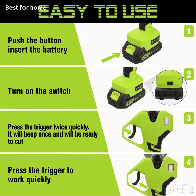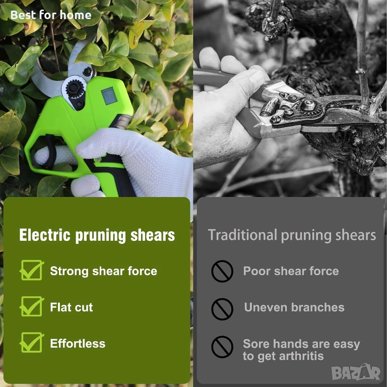 【Лесна употреба и ергономичен дизайн】: След натискане на бутона за захранване, електрическата ножица ще остане неактивна, докато не натиснете бързо спусъка два пъти, което помага за предотвратяване на инциденти. Ако спусъкът не бъде натиснат в продължение на 60 секунди, електрическата ножица за клони ще премине в режим на автоматично заспиване, за да предотврати случайно рязане. Бързото натискане на спусъка два пъти я връща към живот. Дръжката е ергономично проектирана, за да предложи максимален комфорт. Включва омекотена дръжка за безпроблемно подрязване.