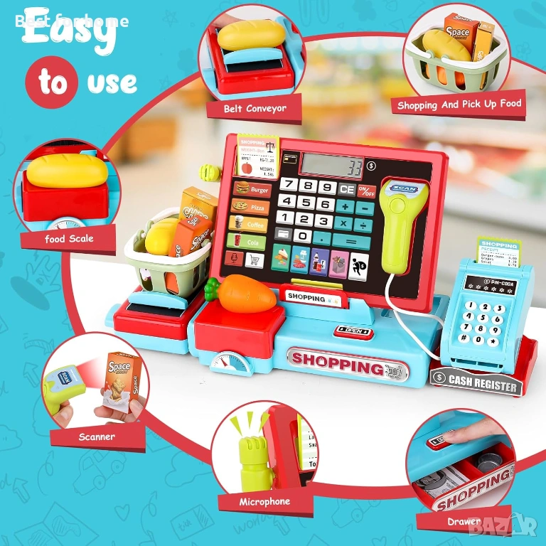 [Образователни STEM играчки] Подходящ за деца над 3 години, този касов апарат е идеален за малки деца, за да развихрят въображението си, като същевременно подобрява фината моторика, броенето и математиката и превръща малките в продавачи или клиенти, точно както в истински супермаркет.