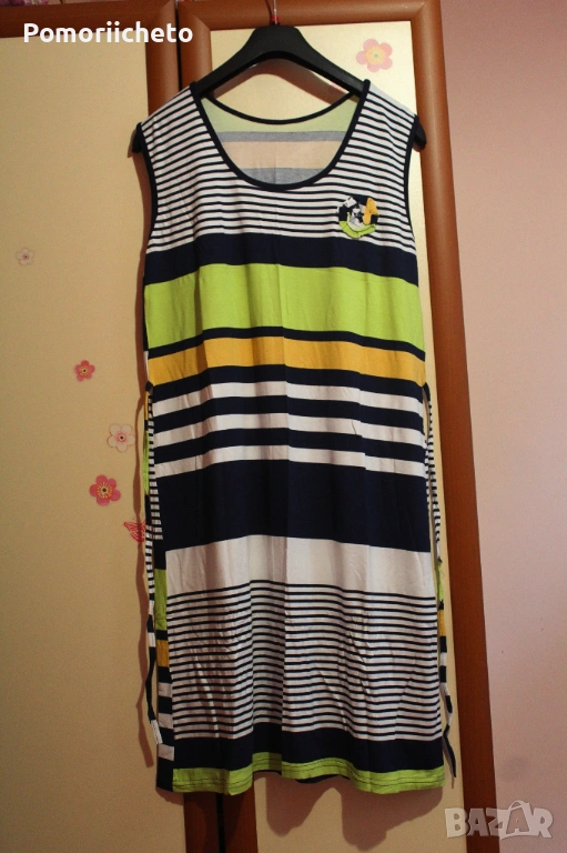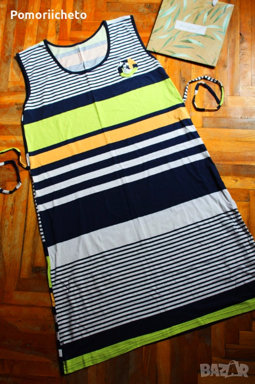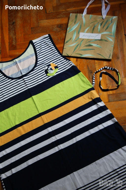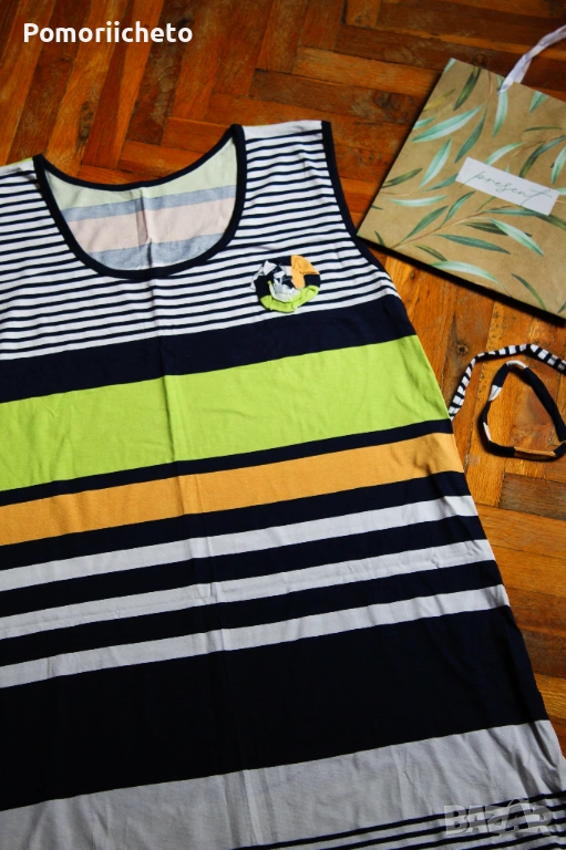 Чисто нова рокля, никога не е носена, няма забележки. Семпъл модел, но красив и весел дизайн в приятни цветове и десен на райета. Може да се носи както ежедневно, така и за не много официални поводи. Приятна материя, достатъчно плътна, за да не прозира, но достатъчно лека, за да не спарва през топлите летни дни.Подходяща за размер М, дължината е до коленете, с дебели презрамки, пришити връвки като коланче за стягане в талията, декоративно цвете отпред.