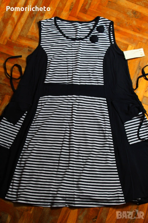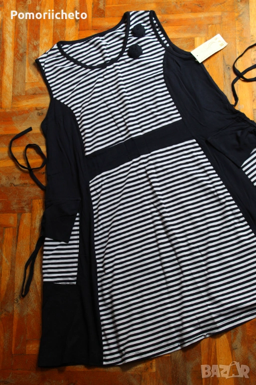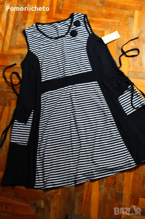 Чисто нова, с етикет, няма забележки. Прекрасна е за лятото, в моряшки стил. Материята е много приятна и лека, но достатъчно плътна, за да не прозира. Памучна е, с дебели презрамки, под талията се разкроява, дължината е до/под коляното. От двете страни има джобове.