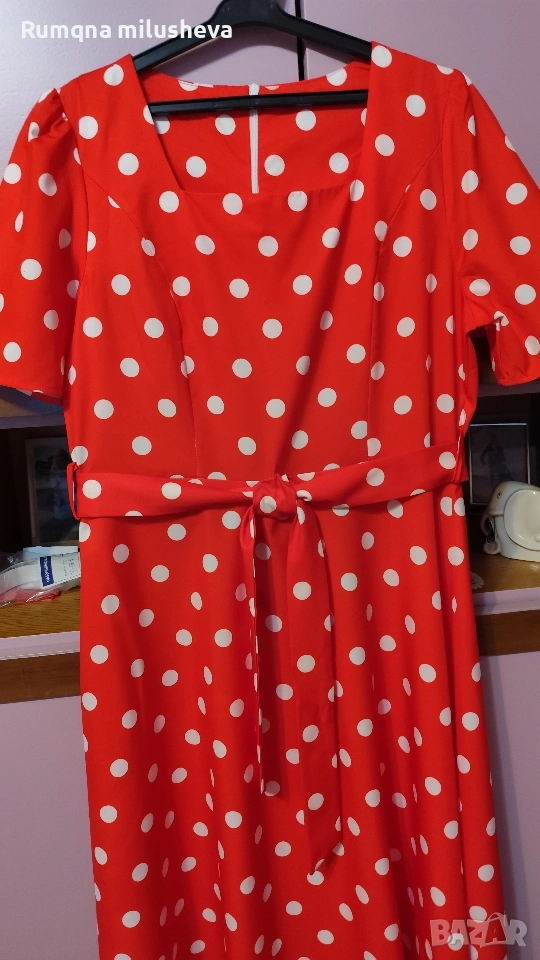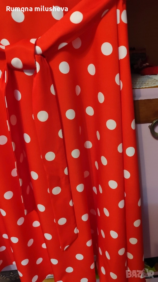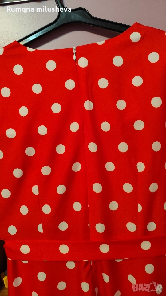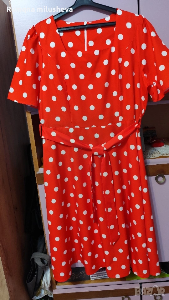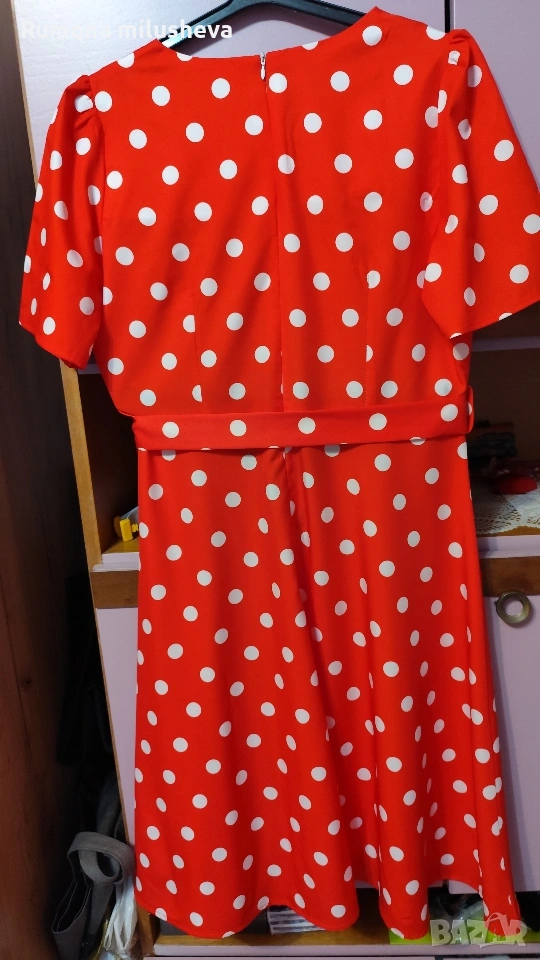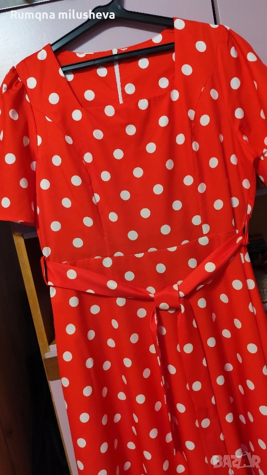 Ефирна рокля цвят червен на бели точки Размер Л с цип отзад къс ръкав рязана в талията . Много приятна материя стои добре