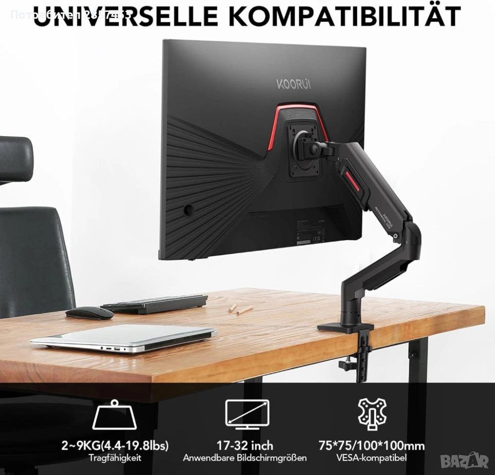 KOORUI KR20Y рамо за монитор - 17-32" | Газов амортисьор | VESA 75/100 | 2–9 кг