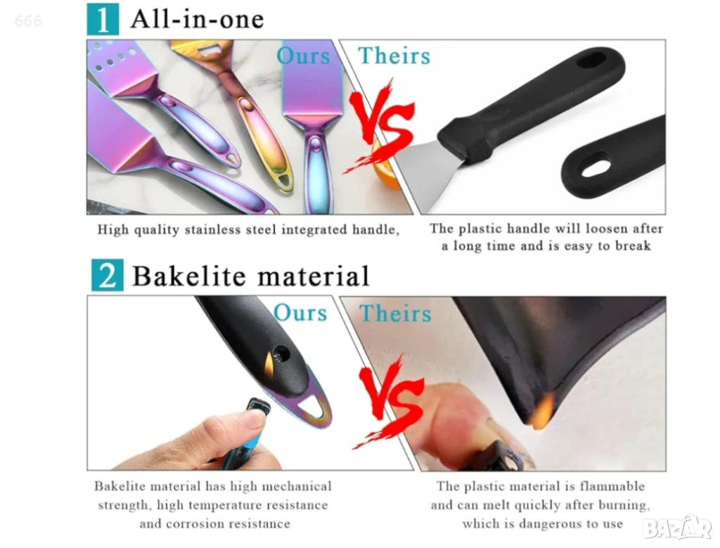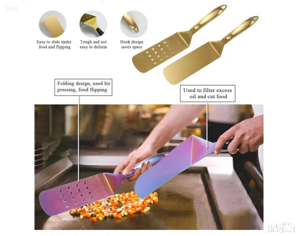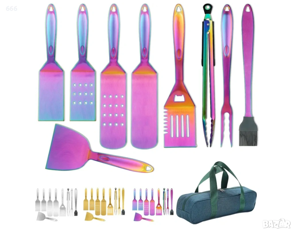 Изработен от висококачествена неръждаема стомана, която е издръжлива и не се деформира или огъва лесно при продължителна употреба. Перфектното покритие на дръжката от неръждаема стомана с бакелит гарантира, че инструментът ви няма да се стопи, дори ако влезе в контакт с пламъка. Инструментите са позлатени с титан. Те изглеждат невероятно и луксозно, помагайки ви да впечатлите гостите си.