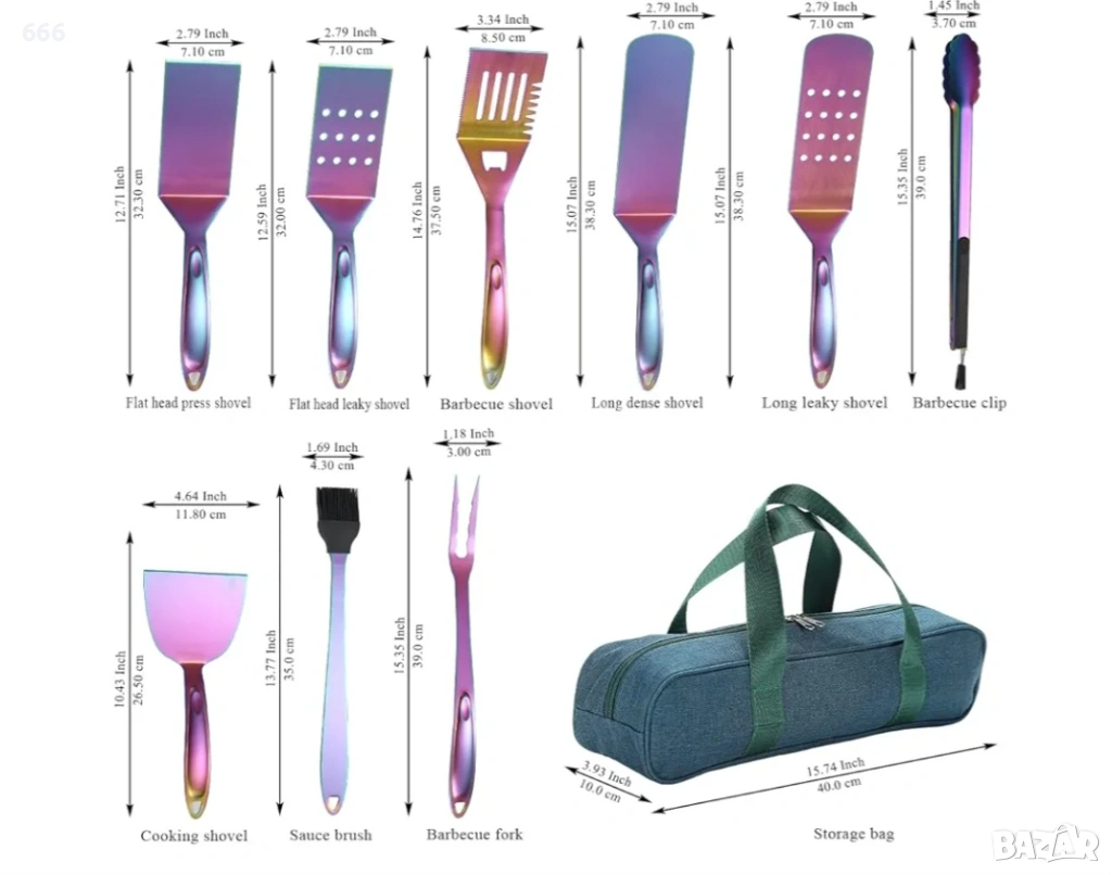 Ще получите пълен комплект инструменти за печене на скара, включително 1 дълга лопатка за пържене, 1 дълга лопатка за пържене, 1 къса лопатка за пържене, 1 многофункционална лопатка, 1 лопатка за готвене, 1 вилица за месо, 1 четка за олио и 1 чифт щипки за барбекю. Нашият комплект от 9 части може да отговори на всички ваши нужди за печене на скара.