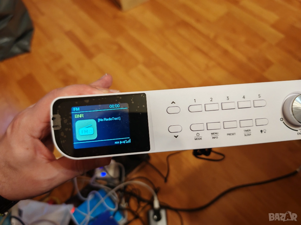 Модерен дизайн с цветен дисплей и удобни бутони за бърз достъп до станции и функции. Подходящо за дома, офиса или работилница.