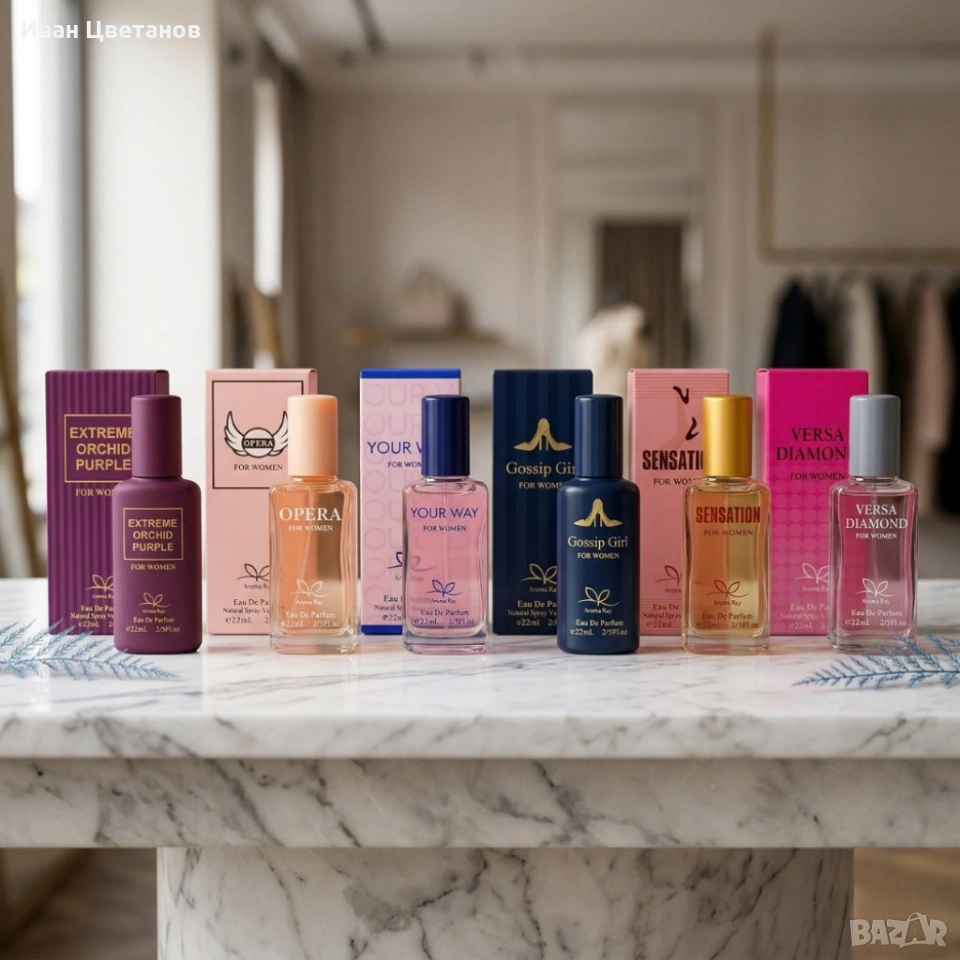 Комплекта включва: OPERA - for woman 22ml Eau De Parfum, YOUR WAY - for woman 22ml Eau De Parfum, SENSATION - for woman 22ml Eau De Parfum, Gossip Girl - for woman 22ml Eau De Parfum, EXTREME ORCHID PURPLE 22ml Eau De Parfum, VERSA DIAMOND = for woman 22ml Eau De Parfum.