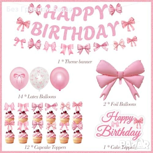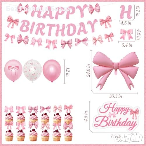 Включва банер Happy Birthday, 2 фолиеви балона панделка, 8 латексови балона