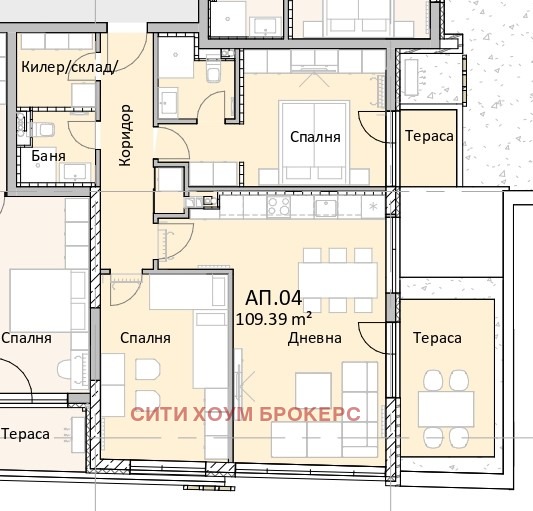 Състои се от дневна с кухненски бокс и трапезария, две самостоятелни стаи, две бани, две складови помещения и две тераси.