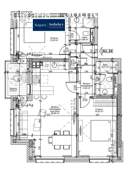 Разпределение: дневна с трапезария и кухненски бокс, лоджия, две спални, две бани с тоалетни, склад.