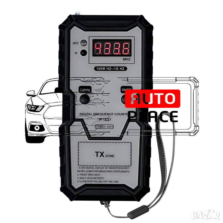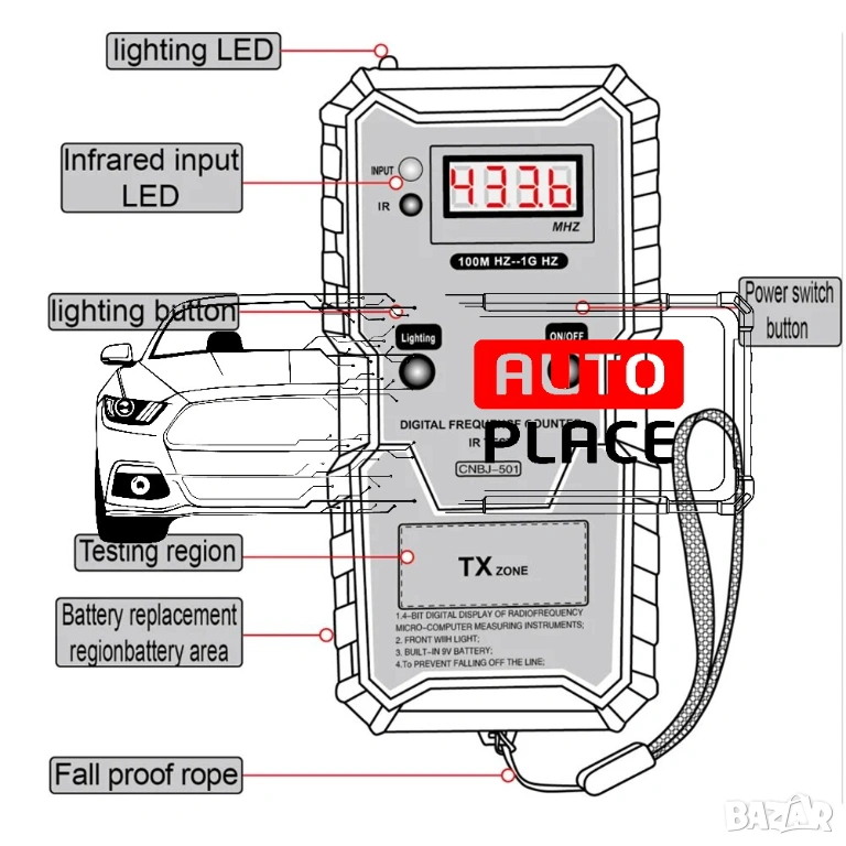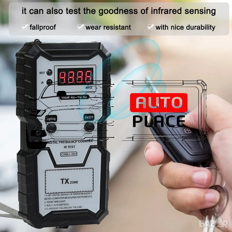Този продукт е тестов инструмент за измерване на честота на безжично дистанционно управление, той може да тества честотата на дистанционното управление която ще бъде изписана на дисплея. Може да тества инфрачервената индукция дали е добра или лоша.