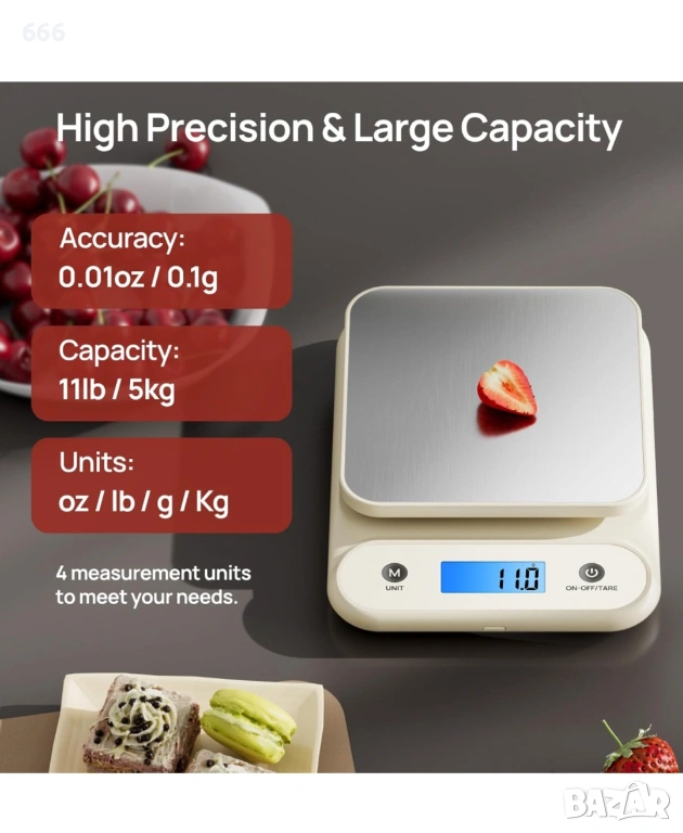 Голям капацитет от 11 фунта: Капацитетът на претегляне (0,01 oz / 0,02 oz - 11 фунта / 11,0 фунта) отговаря на повечето нужди от претегляне в кухнята и в ежедневието. LCD екранът с подсветка осигурява ясна видимост дори на тъмно.