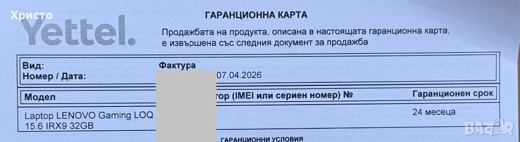 Предлагам гейминг лаптоп Lenovo LOQ 15IRX9 в абсолютно ново състояние – устройството никога не е активирано и не е използвано. Моделът е изключително мощен и подходящ както за гейминг, така и за работа с тежки програми, благодарение на комбинацията от модерен процесор Intel Core i5 от 13-то поколение, 32GB RAM и видеокарта RTX 3050. Лаптопът е закупен на 7 Април 2026 година с 24 месеца гаранция. Без бартери!!!