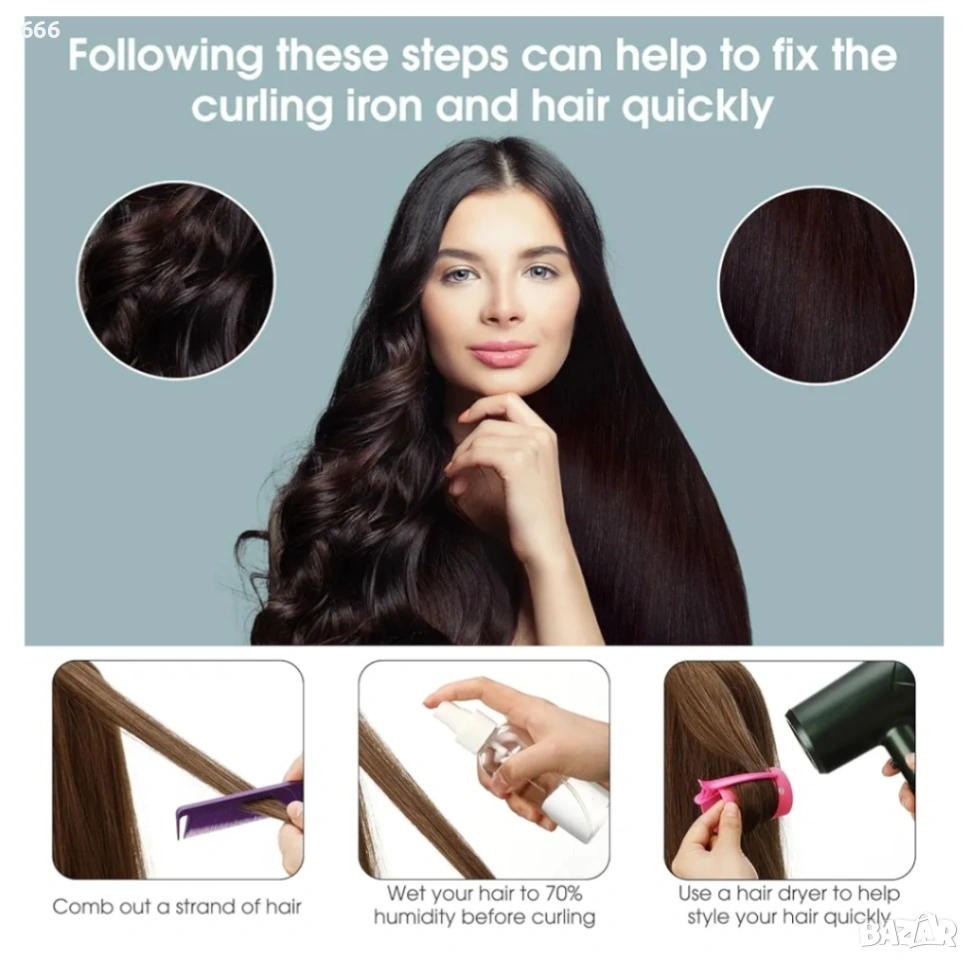 Приятелско напомняне: Различните стилове и текстури на косата могат да доведат до различни резултати; колкото по-гъста е косата ви, толкова повече маши са ви необходими; моля, изберете правилното количество продукт според обема на косата ви; преди употреба, моля, разделете косата си на подходящи секции и се опитайте да я поддържате седем до осем процента суха; вземете кичур коса с ширина 1 инч и го навийте на руло, така че косата да побере напълно вътре в машата.