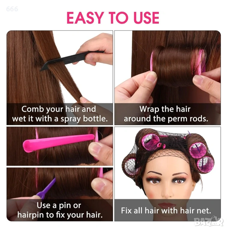 Без увреждане на косата: Пластмасовата маша не е необходимо да се нагрява; повърхността е гладка и не залепва за косата. Този дизайн намалява скубането на косата, като ефективно минимизира загубата на коса, причинена от дърпане. Необходимо е да се закрепи с фиби и щипки, за да се направят къдриците по-обемни и гладки.