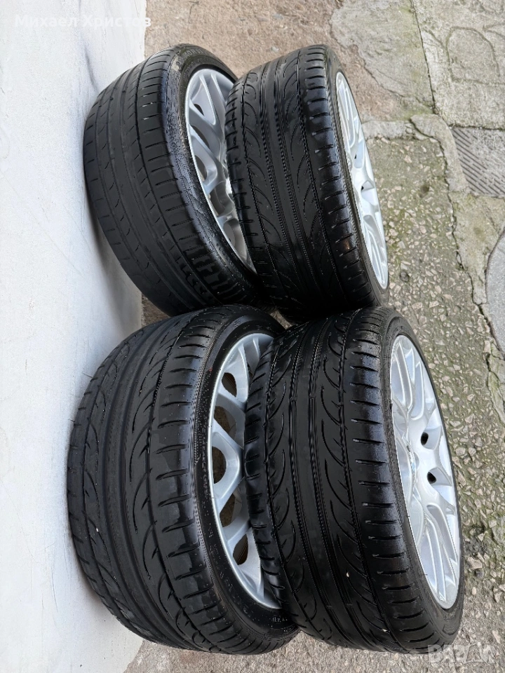 Внос Германия, задни 8,5джи ет37, предни 8джи, ет 34, задни гуми 255-35, предни 225-40, гумите са летни и са доста добри.