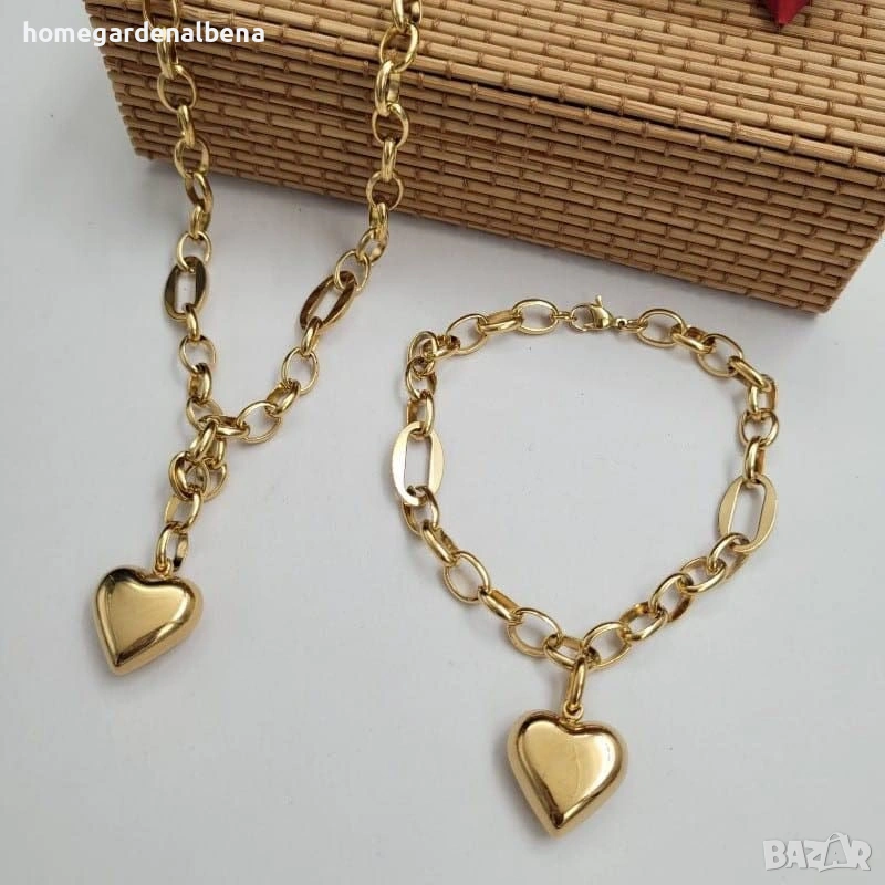 дамски комплект от колие и гривна — изработени от медицинска стомана 316L с 18-каратово златно покритие. Комбинираната верига от овални и кръгли халки носи обемна полирана висулка у формата на сърце — нежна и изразителна. Комплектът носи еднакъв дизайн на двете изделия за завършен, хармоничен вид. Хипоалергенен, водоустойчив. Идеален за подарък за рожден ден, Свети Валентин или специален повод.