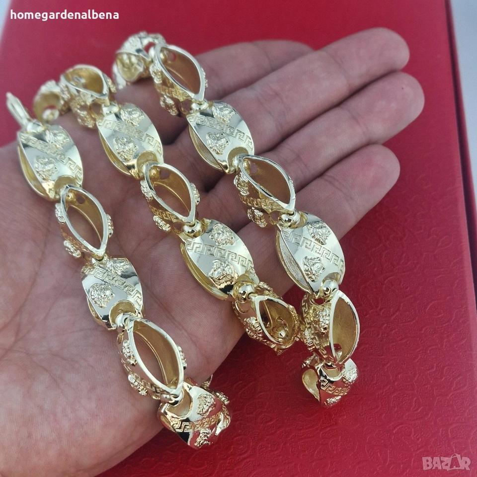 мъжки ланец с изключително богата декорация — изработен от медицинска стомана 316L с 18-каратово златно покритие. Широките овални звена са украсени с гравиран гръцки меандър и релефни лъвски глави — символ на сила, благородство и доминиращо присъствие. Закопчалката е оформена като сърце — изненадващ нежен детайл в контраст с мощния характер на ланеца. Масивна и прецизна изработка. Хипоалергенен и водоустойчив.